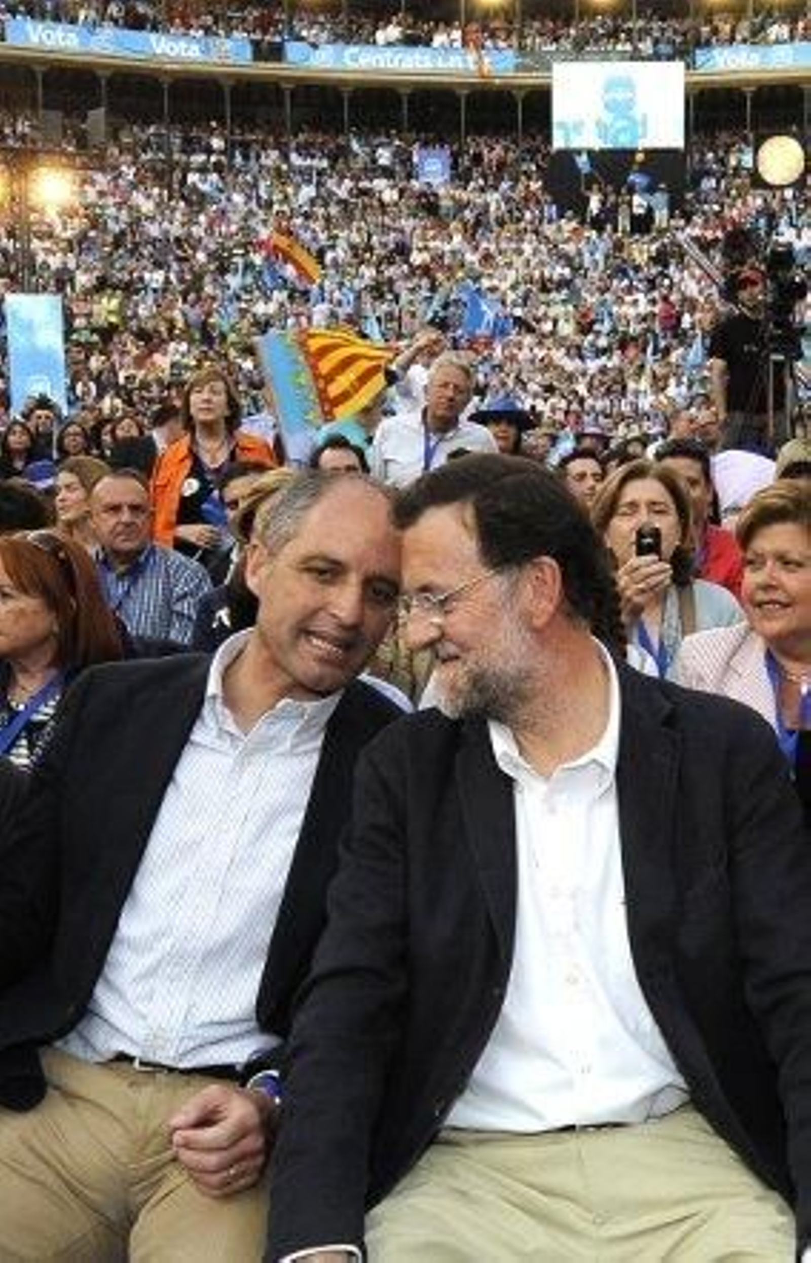 La fiesta comenzó con vítores, con un paseo de Rajoy, Camps y Barberá por el callejón de la plaza de toros, convertidos en los focos de atención de 20.000 personas que han llegado al coso en 370 autobuses de todos los rincones de la Comunidad.