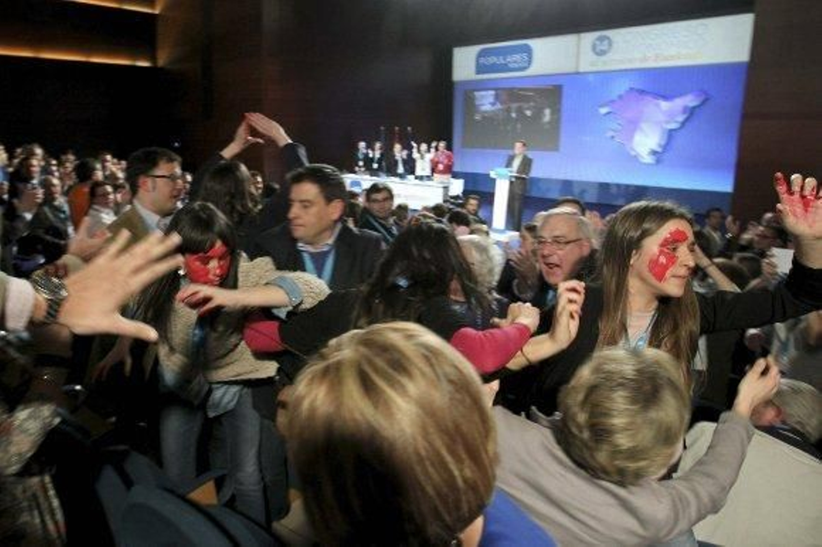 El discurso de Rajoy ha sido interrumpido en su inicio por cuatro mujeres que se encontraban sentadas entre los compromisarios del Congreso, en la quinta fila de la sala de Cámara del Kursaal y que han gritado consignas como "Aborto ilegal, violencia estatal" y "Gure gorputza, gure erabakia" (Nuestro cuerpo, nuestra decisión), mientras alzaban las manos. Las cuatro jóvenes llevaban las manos y la cara pintadas de rojo y todas ellas exhibían acreditaciones de invitadas al cónclave popular, que cuenta con severas medidas de seguridad. Mientras los delegados trataban de acallar los gritos con aplausos y consignas de "sí a la vida", miembros de la seguridad del partido han desalojado a las activistas, que no han mostrado resistencia, y las han expulsado del Kursaal.