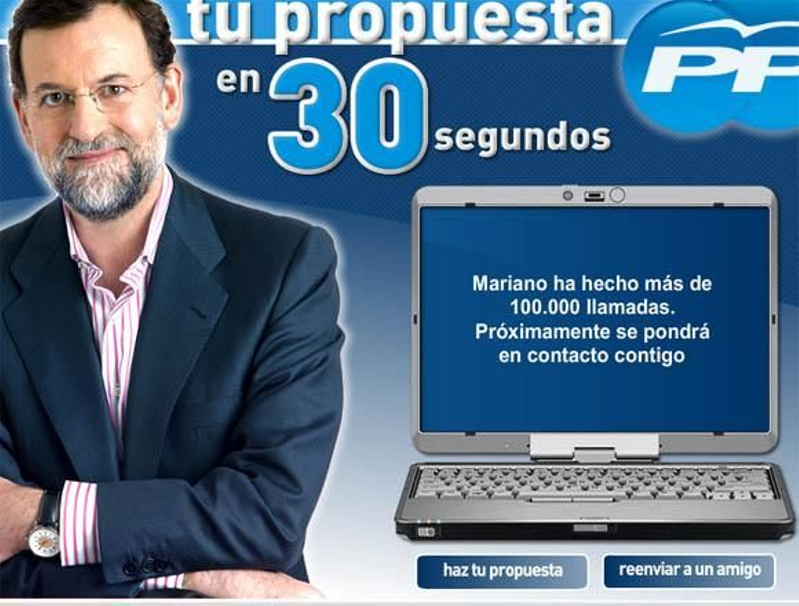 Tras la llamada de Rajoy, a partir de ahora un correo electrónico, el interesado quedaba en disposición de colgar de la web un spot con su propuesta electoral. El premio: la exhibición del vídeo en la televisión nacional.