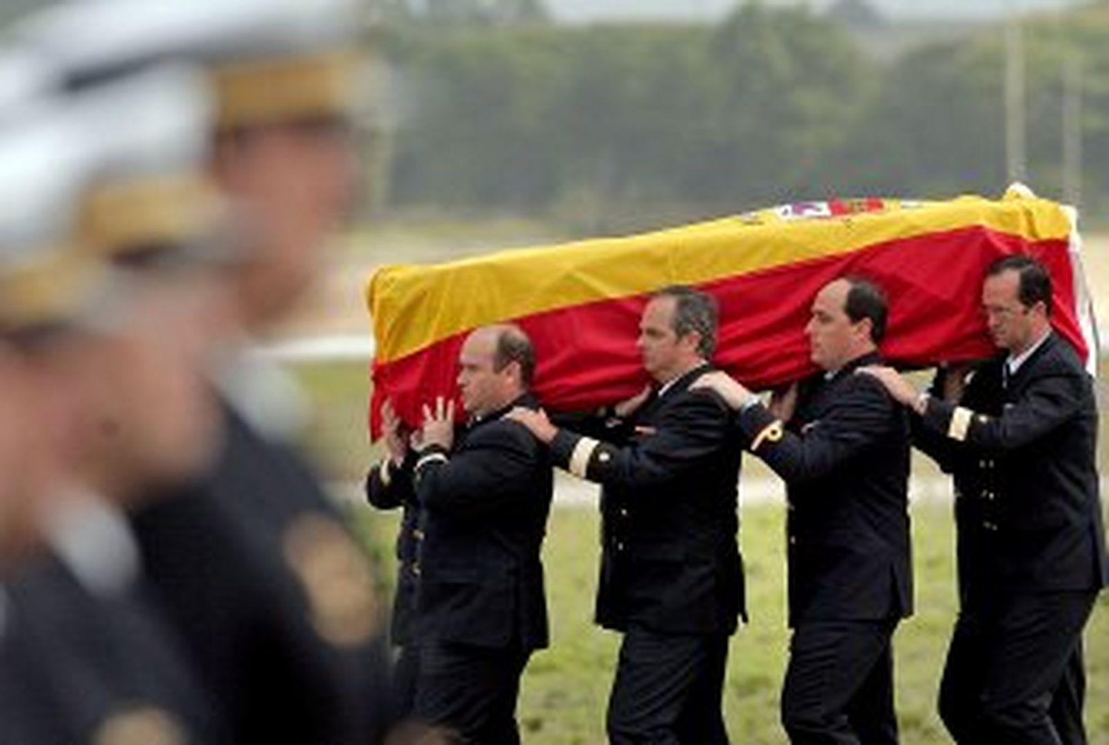 Instantes después los compañeros de los marinos fallecidos han portado a hombros los féretros con los restos mortales de Luis Fernando Torija Sagospe, comandante del Cuerpo de Intendencia; Francisco Forne Calderón, teniente de Infantería de Marina; Manuel Dormido Garrosa, alférez de navío, y Eusebio Villatoro Costa, cabo mayor de Infantería de Marina, hasta el frente del hangar, mientras sonaba la marcha fúnebre.