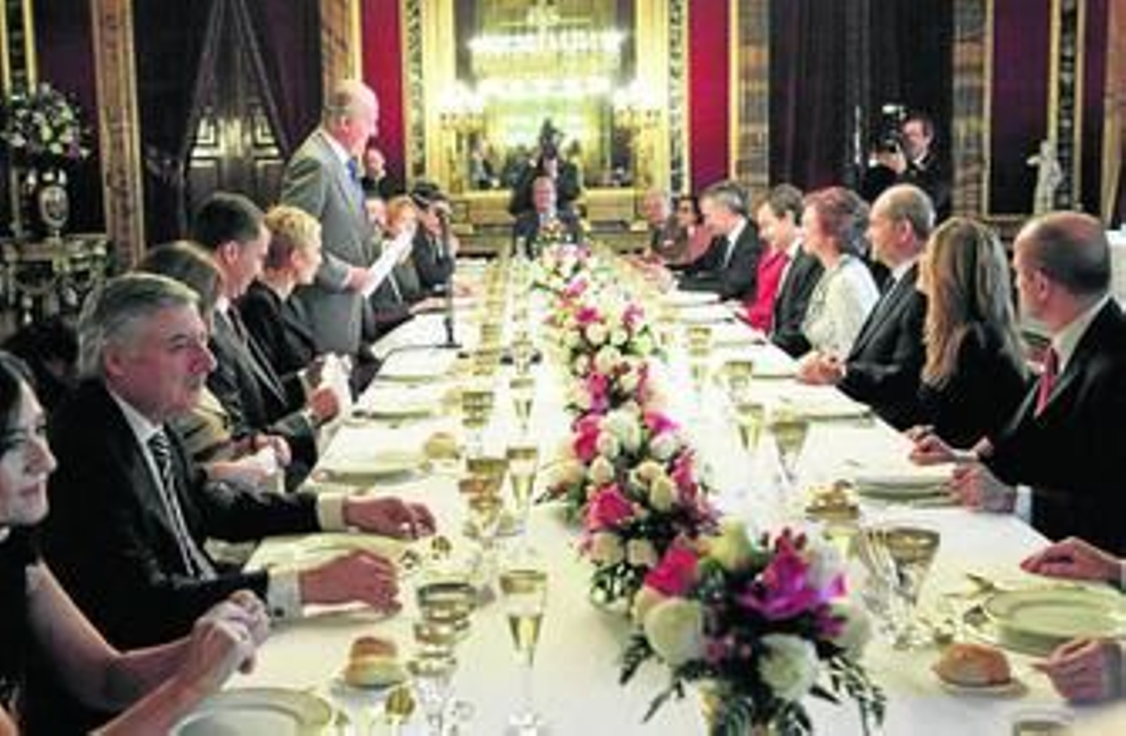 Durante el almuerzo, don Juan Carlos estuvo flanqueado por Sonsoles Espinosa -a cuya derecha se sentaba el Príncipe- y la vicepresidenta económica del Gobierno, Elena Salgado, y doña Sofía por Rodríguez Zapatero -sentado a la izquierda de doña Letizia- y el vicepresidente de Política Territorial, Manuel Chaves.