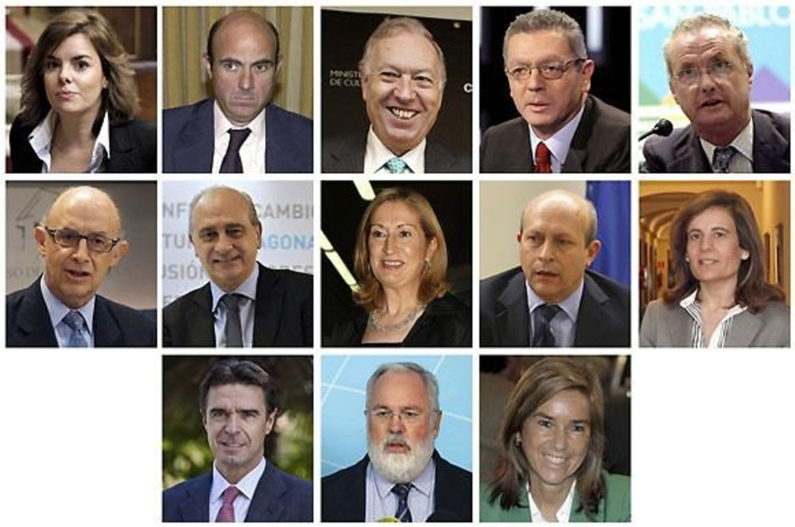 Composición del primer Gobierno de Mariano Rajoy: vicepresidenta primera, ministra de la Presidencia y ministra Portavoz: Soraya Sáenz de Santamaría; Ministro de Economía y Competitividad: Luis de Guindos; Ministro de Asuntos Exteriores y Cooperación: José Manuel García Margallo; Ministro de Justicia: Alberto Ruiz-Gallardón; Ministro de Defensa: Pedro Morenés; Ministro de Hacienda y Administraciones Públicas: Cristóbal Montoro; Ministro de Interior: Jorge Fernández Díaz; Ministra de Fomento: Ana Pastor; Ministro de Educación, Cultura y Deporte: José Ignacio Wert; Ministra de Empleo y Seguridad Social: Fátima Báñez; Ministro de Industria, Energía y Turismo: José Manuel Soria; Ministro de Agricultura, Alimentación y Medio Ambiente: Miguel Arias Cañete y Ministra de Sanidad, Servicios Sociales e Igualdad: Ana Mato.