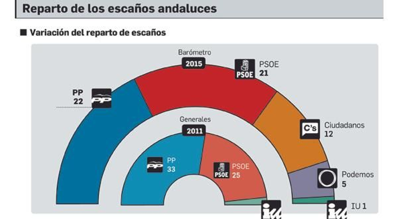 El PP lograría un 28,19% de la estimación de voto, mientras que el PSOE se quedaría en el 27,31%, la distancia es pequeña e inferior al margen de error del sondeo, que se sitúa en el 3,4%. Ciudadanos se lanza hasta el 20,69%, a siete puntos de Podemos, que llega al 13,01%. IU logra un 4,81%. En escaños, Andalucía reparte 61 diputados, los populares obtienen de 22 (ahora tienen 33); el PSOE se apunta 21 (ahora son 25), y se estrenan Ciudadanos, con 12, y Podemos, con cinco. IU gana uno por la provincia de Cádiz, pero pierde los que ahora tiene en Málaga y en Sevilla.