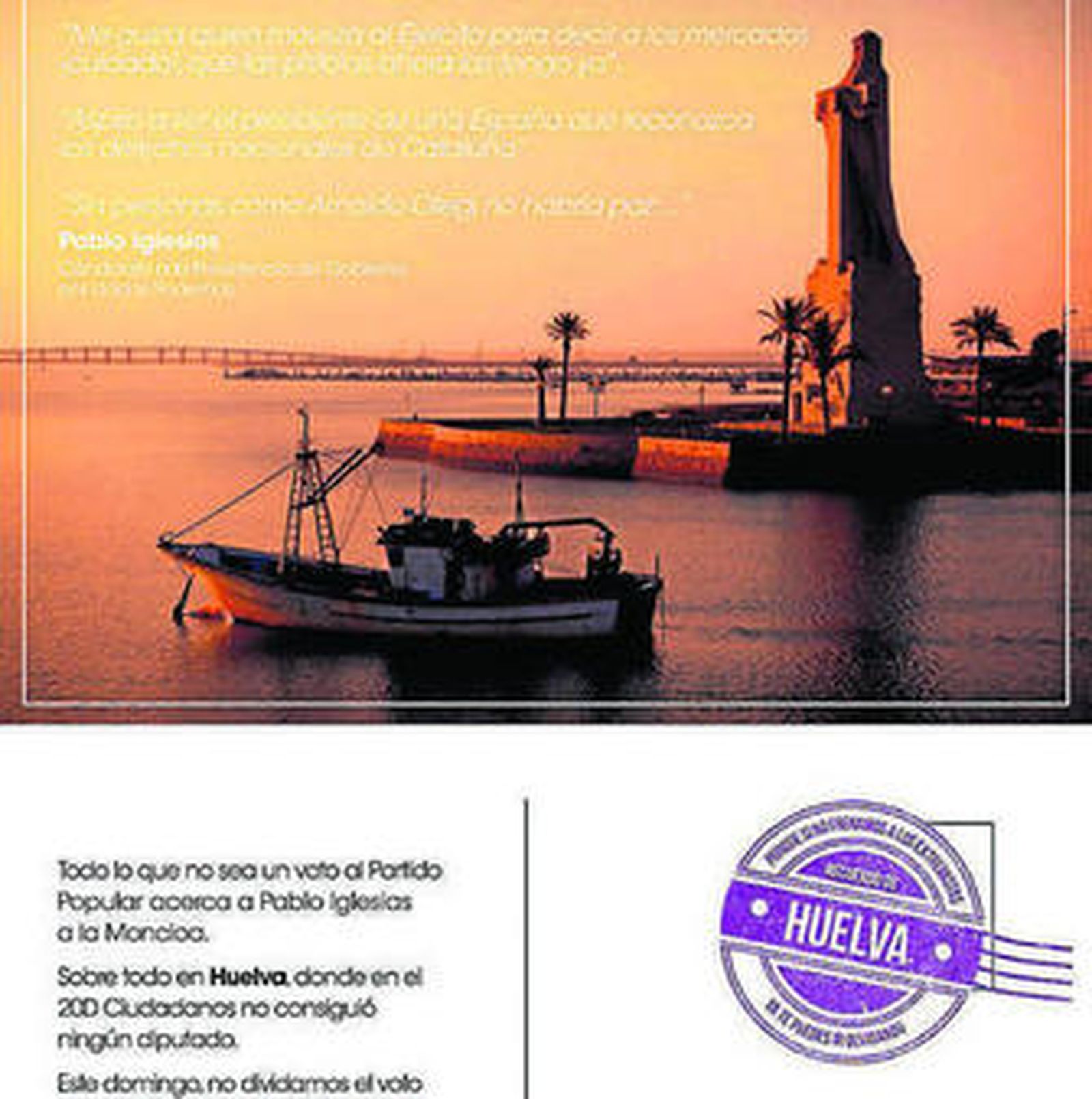 La idea viene desde Madrid. El PP apura el último cartucho e intensifica estos días, en la recta final de la campaña, su llamada al voto útil al PP ante el ascenso de Podemos. Lo hace con una estrategia publicitaria que no ha pasado desapercibida. Para animar a no dividir el "voto moderado", los populares han lanzado una llamativa campaña a base de postales en aquellas provincias en las que C's no obtuvo representación a pesar de cosechar un número importante de papeletas, al objeto de que los votantes de la formación naranja respalden ahora a los azules. Cada postal se ilustra con imágenes identificativas de la provincia o capital en cuestión y, en el caso de Huelva, la estampa elegida es la del Monumento a la Fe Descubridora, en pleno atardecer.
