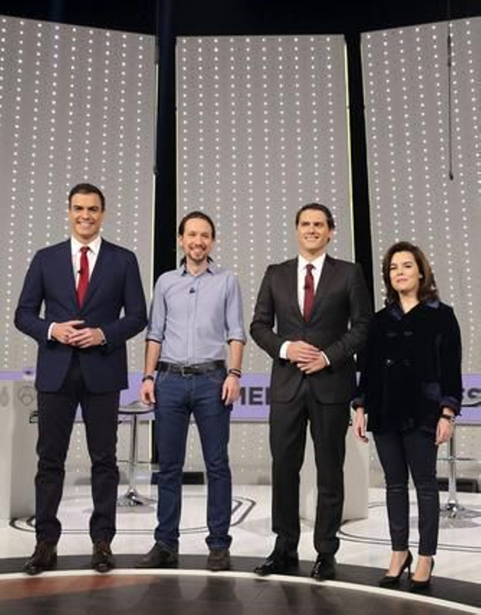 Después hubo dos bloques en el que los participantes hablaron alternativamente pero no con un orden preestablecido. Economía, Estado del bienestar, reformas institucionales... Sin tiempos tasados, los moderadores imprimieron el ritmo, aunque la llamada sala del tiempo midió la duración de todas las intervenciones para buscar un equilibrio entre todos los participantes. Lo hubo. Los tuteos no fueron una constante como en el anterior debate a tres, las interrupciones sí. La que más tiempo utilizó fue la vicepresidenta y el que menos, Sánchez, al que se le escapaba de vez un cuando un "madre mía" ante los argumentos de sus rivales.