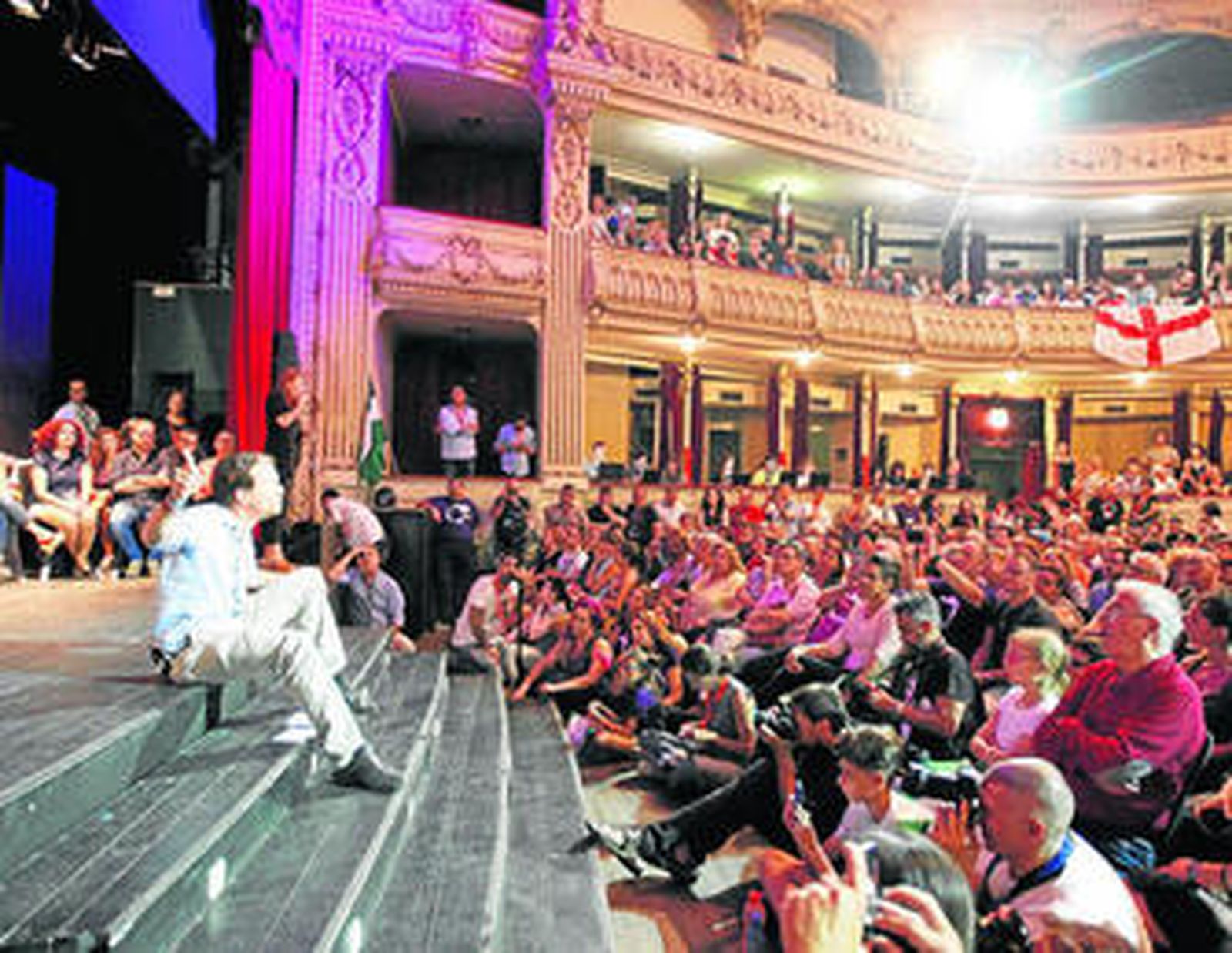Un mitin de Podemos es un escenario distinto, con una excitante puesta en escena. Iglesias aparece mientras suena la banda sonora de la película Cazafantasmas, todo un himno del que Podemos se ha apoderado. Aun así, la imagen de Podemos ha vuelto a cambiar. El propio Iglesias le ha dado un giro: al patriotismo le ha añadido la serenidad y su discurso se ha riverizado. Sentado en las escaleras de acceso al escenario del Cervantes, habló en un tono moderado, dialogando y sin desgañitarse.