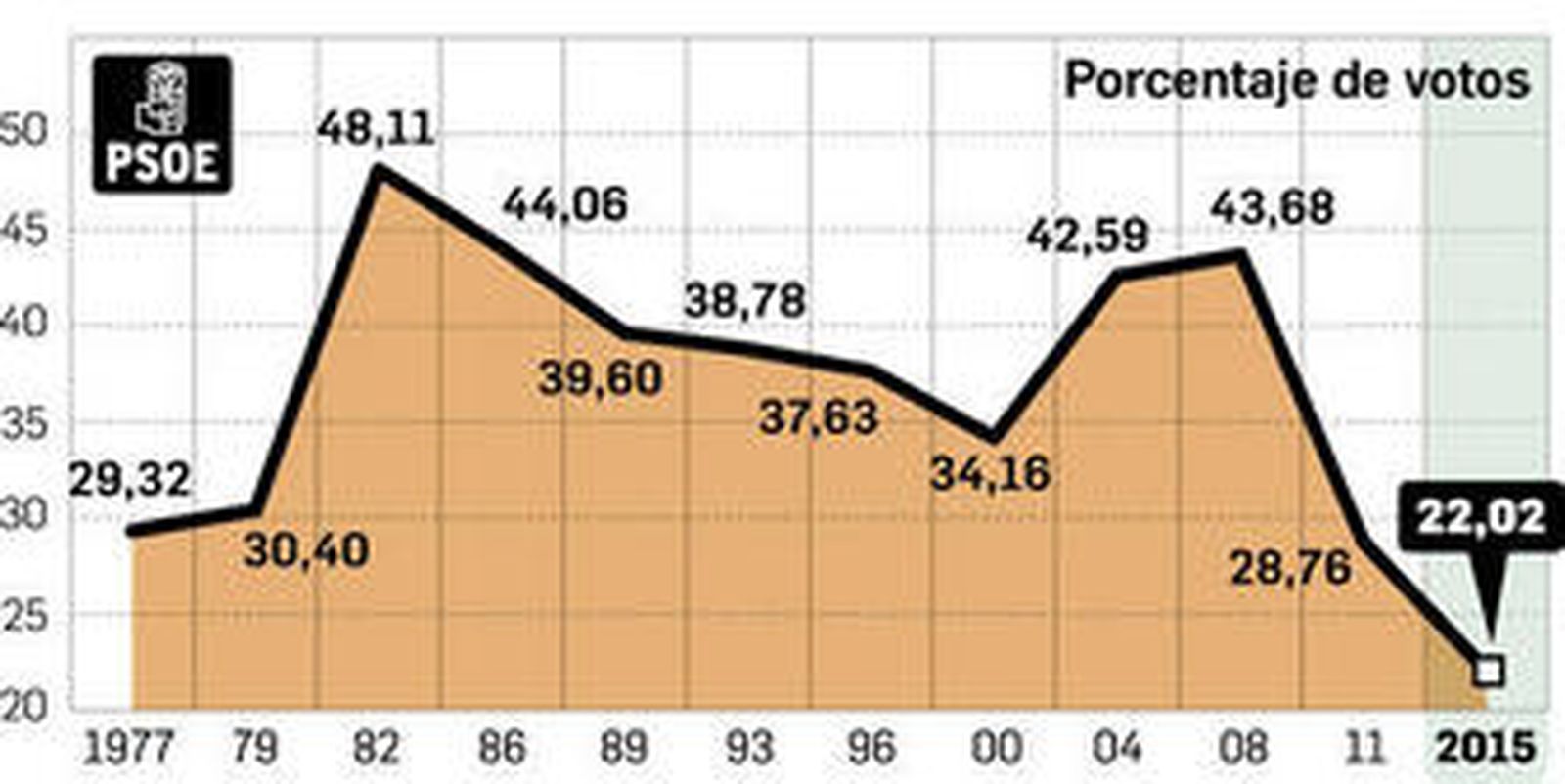 El PSOE consigue los peores resultados de su historia desde la restauración de la democracia en España. Pierde un millón y medio de votos y 20 escaños, pero el botín parece suficiente para los socialistas que continúan como segunda fuerza y con relativa capacidad de maniobra. Pueden intentar llegar a Moncloa con el apoyo del resto de la izquierda y los nacionalistas o dejar gobernar a Mariano Rajoy.