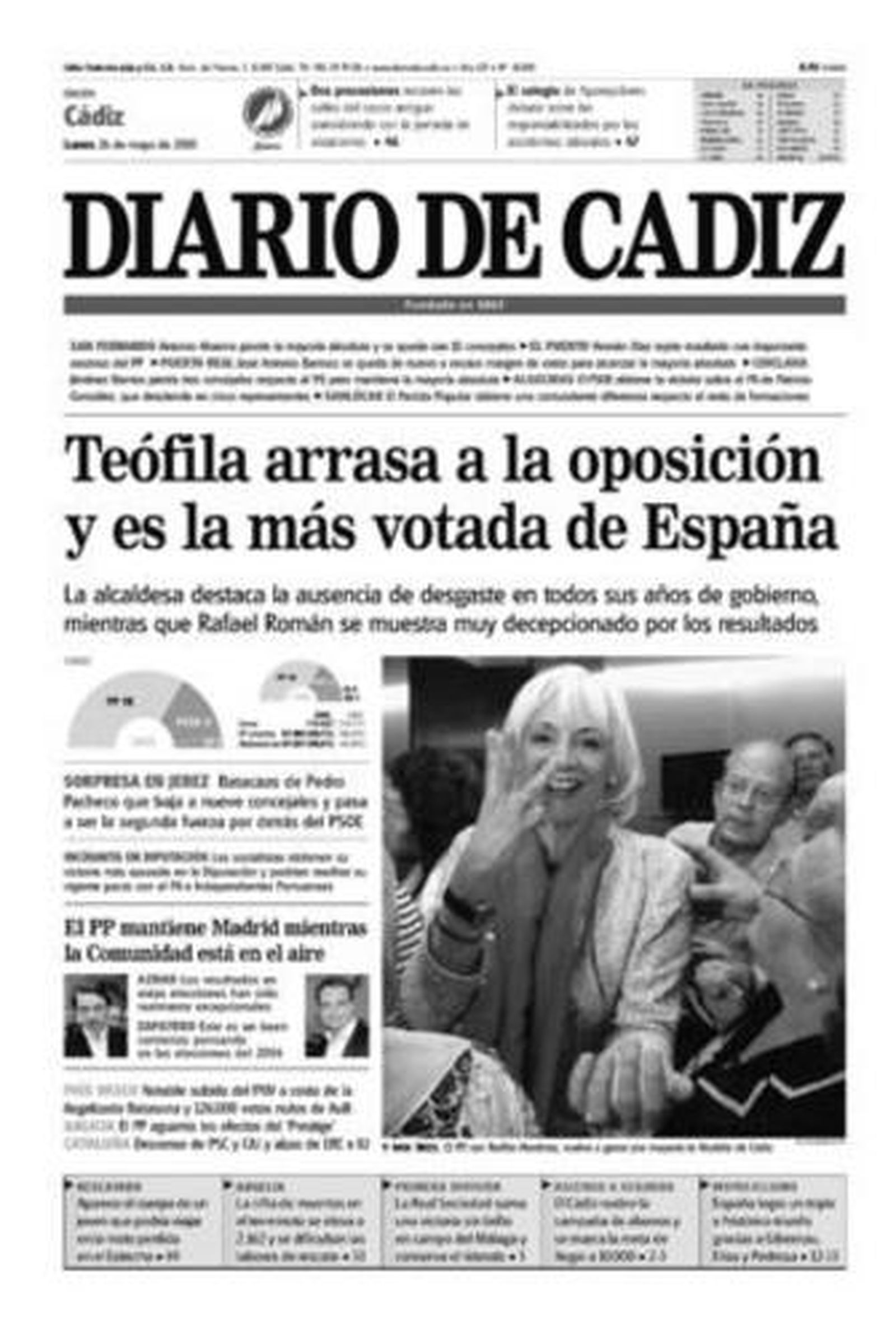 Los titulares en portada del Diario de Cádiz de 26 de mayo de 2003 eran descorazonadores para los que entonces se desgañitaban vociferando la necesidad de un cambio de rumbo en sus pueblos. En la edición de Cádiz se leía a toda plana: "Teófila arrasa a la oposición y es la más votada de España", y una foto de la alcaldesa rodeada de seguidores y enseñando tres dedos de la mano derecha, el mismo número de mayorías obtenidas; en la de San Fernando: "Moreno gana de nuevo pero pierde la mayoría absoluta", con una imagen del vencedor alzando la "V" de victoria; en la de Chiclana: "Jiménez Barrios vuelve a obtener la mayoría absoluta", con la imagen del ahora delegado del Gobierno andaluz en la provincia sonrientísimo y abrazado por una seguidora; en la de El Puerto: "Hernán Díaz repite los diez ediles a pesar del desgaste", y una fotografía acorde con el personaje, en la que el alcalde portuense aparece a hombros de un simpatizante de IP. Los cuatro repitieron como alcaldes (Hernán reeditando su pacto con el PSOE, Moreno por la abstención de éstos y los otros dos haciendo valer su mayoría), pero, por diferentes y variadas razones, sólo Teófila Martínez acabó su mandato de esos cuatro años. Antonio Moreno, quizá por el disgusto de perder la mayoría absoluta, se retiró a mitad de legislatura, igual que hizo Jiménez Barrios, aunque éste por otras razones. A Hernán Díaz lo retiraron los tribunales, inhabilitado para su cargo público. Teófila acabó su mandato, y empezó otro, y está a punto ahora de comenzar de nuevo, si se cumplen los vaticinios de las encuestas.