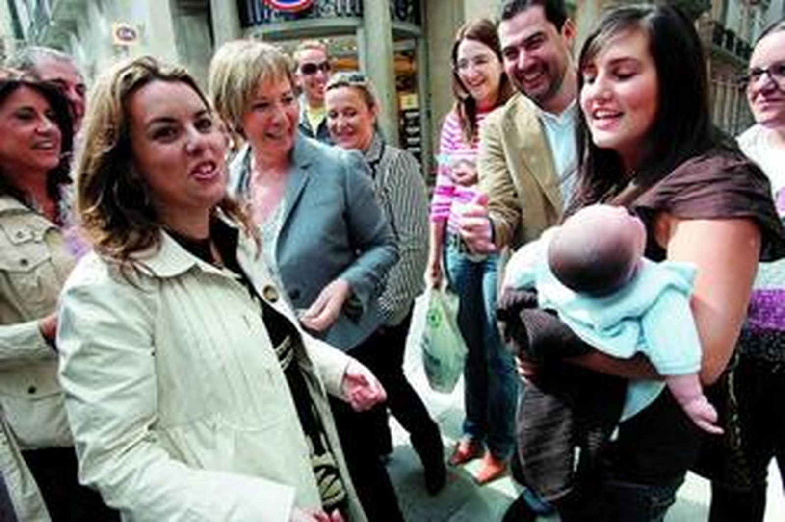 Llega la hora, cerca de la una de la tarde, del anunciado paseo de la candidata popular por las calles el centro de la capital. Una nube de cámaras rodea a Celia Villalobos que sabe que va a darse un nuevo baño de multitudes. El contacto directo con la gente de la calle es su fuerte, debido a su innegable popularidad. En los sondeos la valoran en positivo hasta los votantes socialistas. Con su desparpajo habitual va saludando a unos y a otros, a los que obsequia con un llavero que contiene los horarios del AVE Málaga-Madrid, uno de los temas centrales de la campaña y del que se proclama principal impulsora, así como caramelos, bolígrafos… En compañía de su invitada, aprovecha el paseo electoral para acercarse a los escaparates de la calle Larios y adyacentes, y comentar las "monerías" que se exhiben. Y no tiene inconveniente en entrar en alguno de los comercios, mientras que la comitiva aguarda fuera pacientemente.