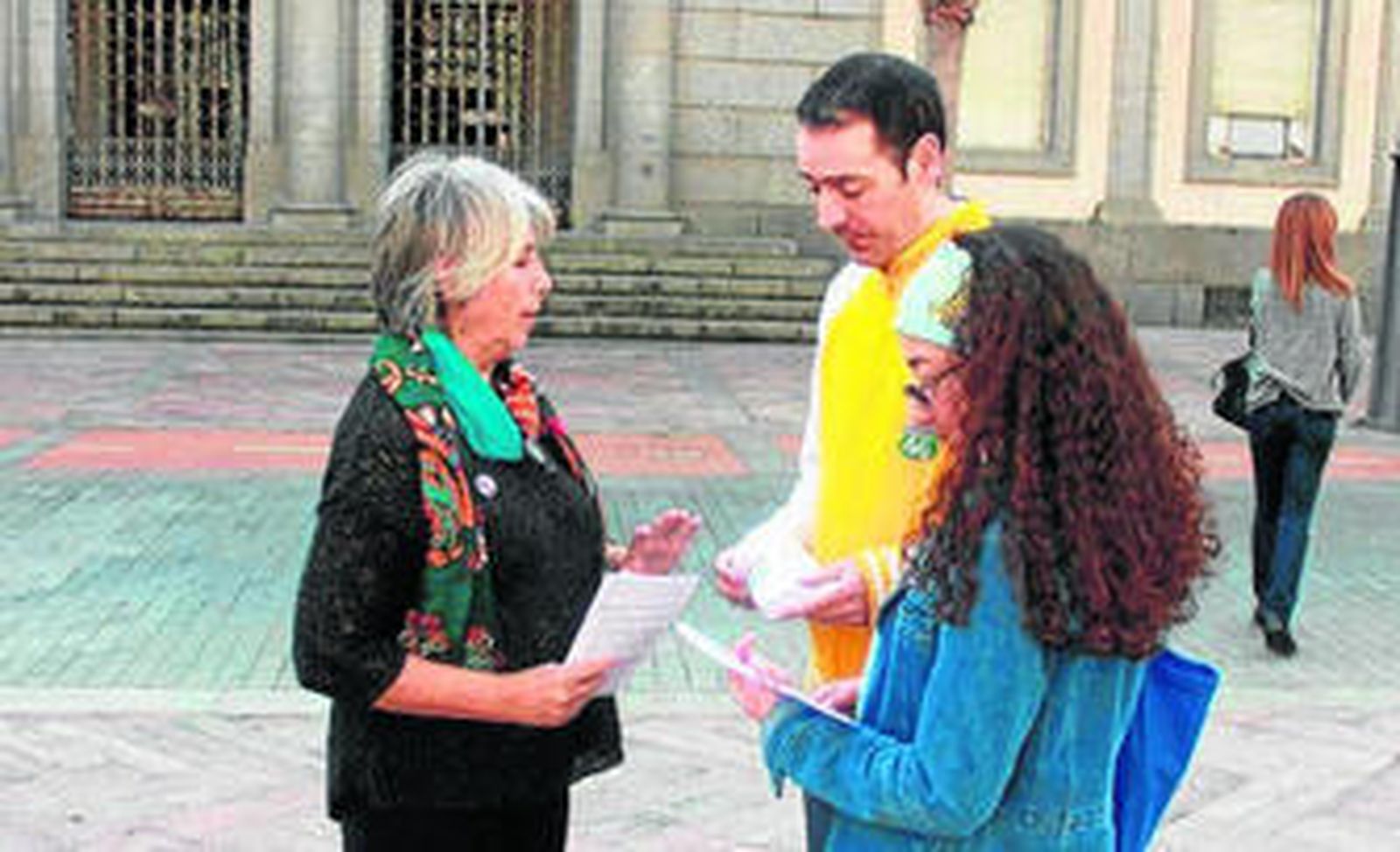 En la plaza de la Constitución, a las puertas del Ayuntamiento, militantes y simpatizantes de Podemos se afanaban en repartir folletos con su propuesta, en la que plantean blindar en la nueva Constitución "una base justa de inversión en servicios públicos" y garantizar en ella "el derecho de las personas dependientes a recibir atención y cuidados", entre otras cuestiones. "La reforma de la Constitución, resaltaba la candidata morada al Senado, Pepa Gallardo, debe ser "social y no un lavado de cara".