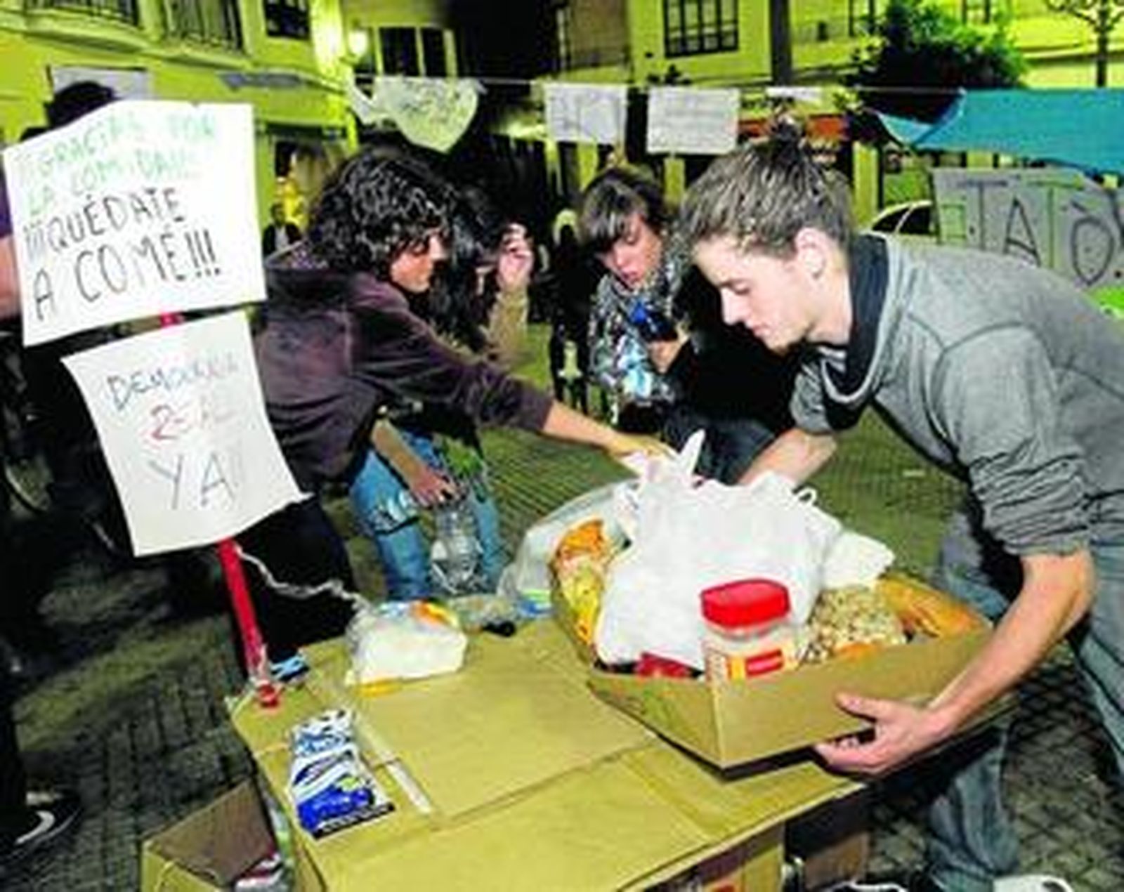 En una de las mesas que hay en el Palillero están todos los víveres para poder aguantar durante la acampada. Cestas con fruta, pan, embutidos, zumos, garrafas de agua... todo aportaciones de personas anónimas que se suman de esta manera a la causa. Como dice Guille, uno de los "indignados" con el sistema, "toda la gente aporta de la manera que puede. Hay quienes podemos quedarnos toda la noche aquí y otros nos traen lo que pueden. Toda ayuda es buena". No hay horarios prefijados para la cena y cada uno puede coger lo que quiera.