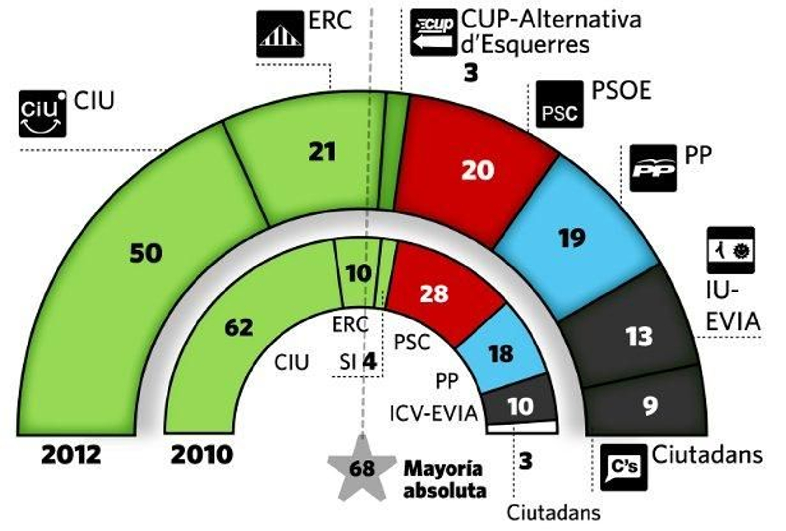El frente soberanista sumaría 87 escaños, siempre que en ese saco se incluya a ICV, partidaria de la consulta de autodeterminación pero no -al menos claramente- de la independencia. La contraparte de ese bloque la conforman los 39 diputados que suman PSC y PP y los nueve que aporta Ciutadans, el partido de Albert Rivera, que triplica los asientos de 2010 y registra 164.000 votos más. En la batalla de los pequeños, Rivera y los suyos -apadrinados en su día por los Boadella, De Carreras, Ovejero y otras voces enemigas del nacionalismo y la corriente identitaria- fueron los grandes vencedores.