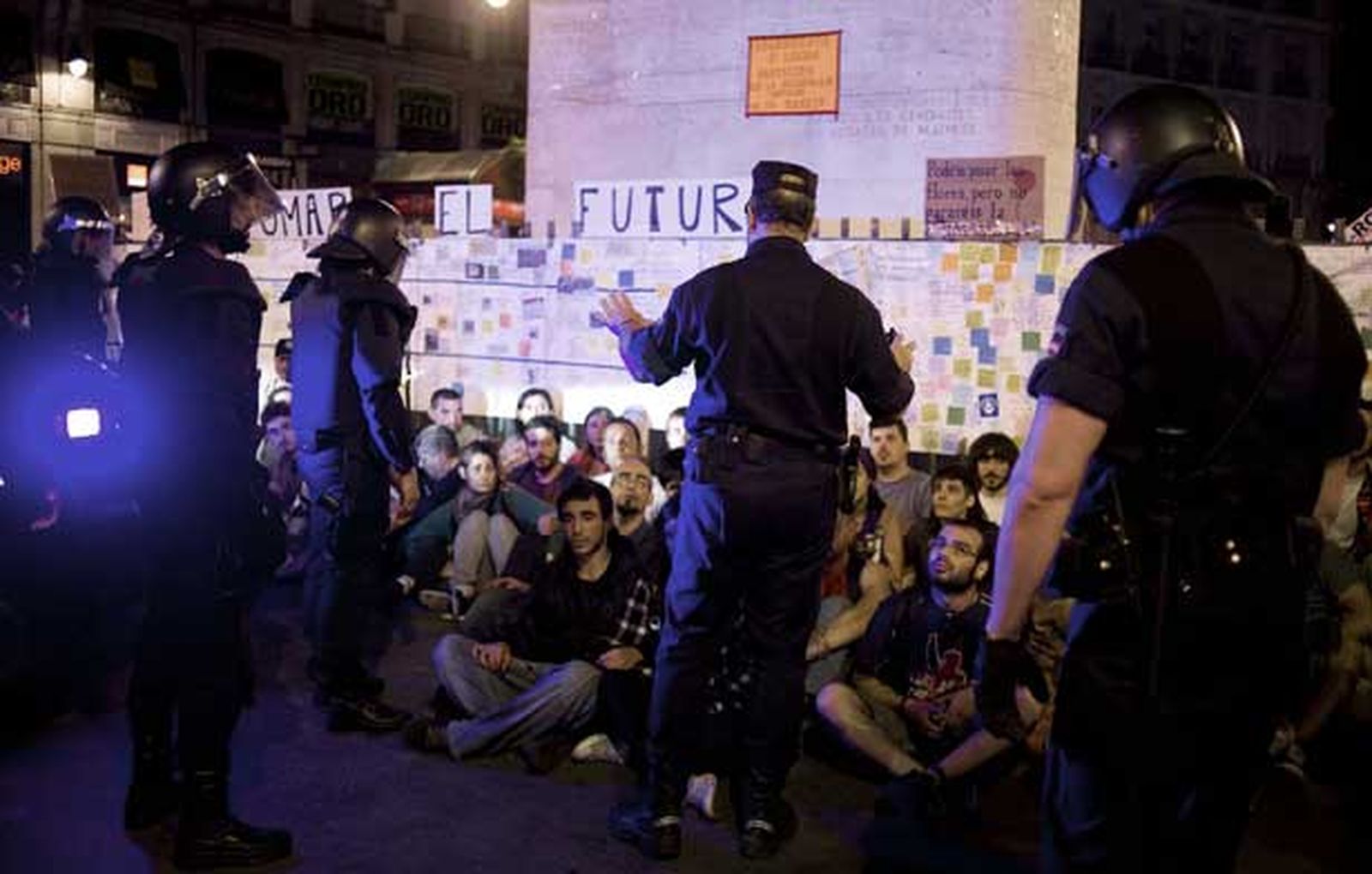 El movimiento está autorizado para concentrarse este lunes en la Puerta del Sol desde el mediodía hasta las 22:00. La madrugada de este lunes la Policía Nacional desalojó a doscientas personas que permanecían en el lugar después de la concentración del día anterior, que también estaba autorizada hasta las 22:00. La intervención ha terminado con la detención de dos personas por "resistencia y desobediencia a la autoridad", según fuentes policiales. @acampadasol ha explicado que las fuerzas del orden procedieron al desalojo poco a poco, "sin carga" policial, cuando alguien que llevaba rato "reventando" la asamblea acabó peleándose con otra persona.