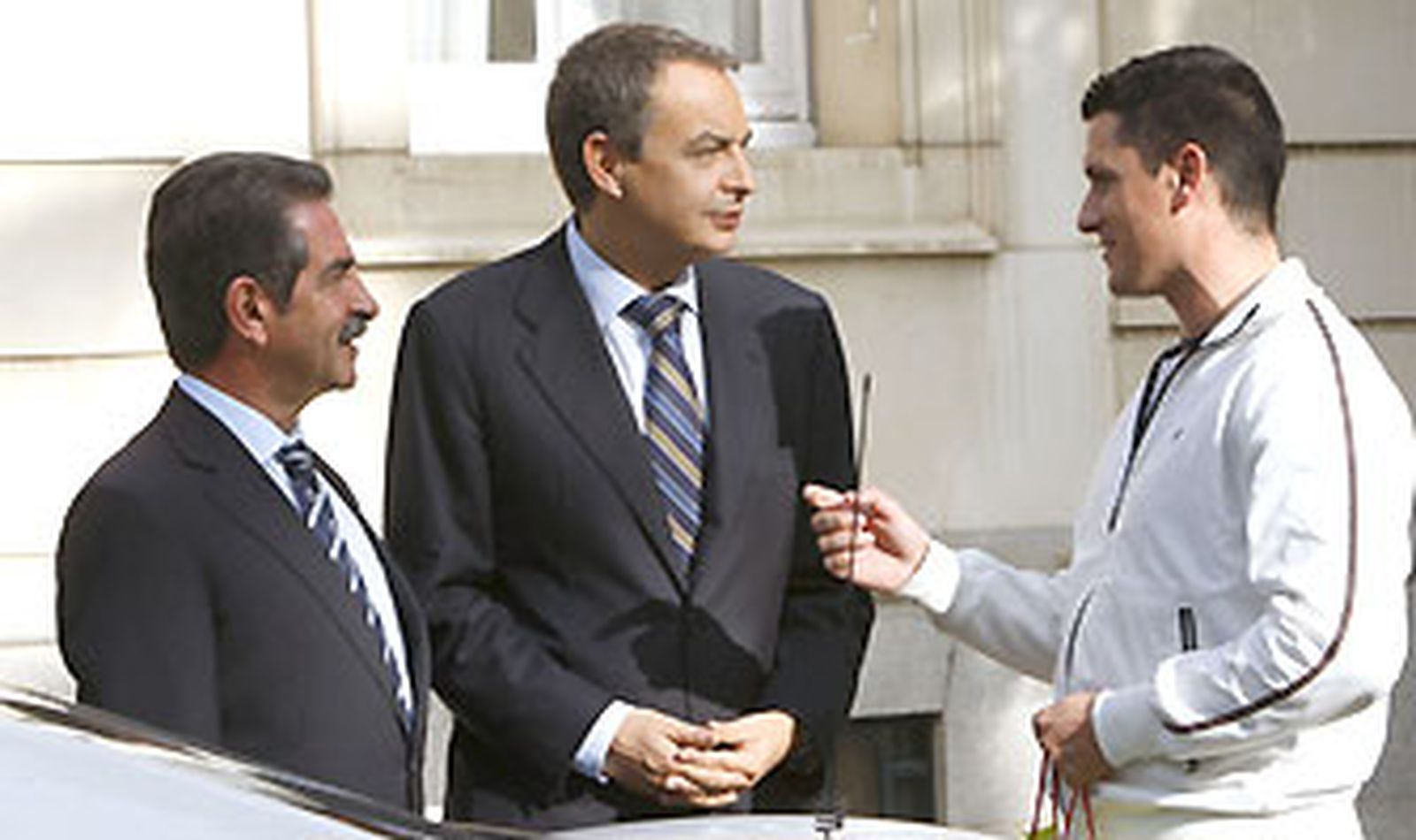 El presidente del Gobierno ha recibido a Revilla al pie de la escalera del Palacio de la Moncloa, donde tras saludarle afectuosamente, han posado para los fotógrafos acompañados del taxista, con quien han hablado durante dos minutos. Revilla ha pedido a Rodríguez Zapatero que se agilicen los plazos de construcción del tren de alta velocidad.