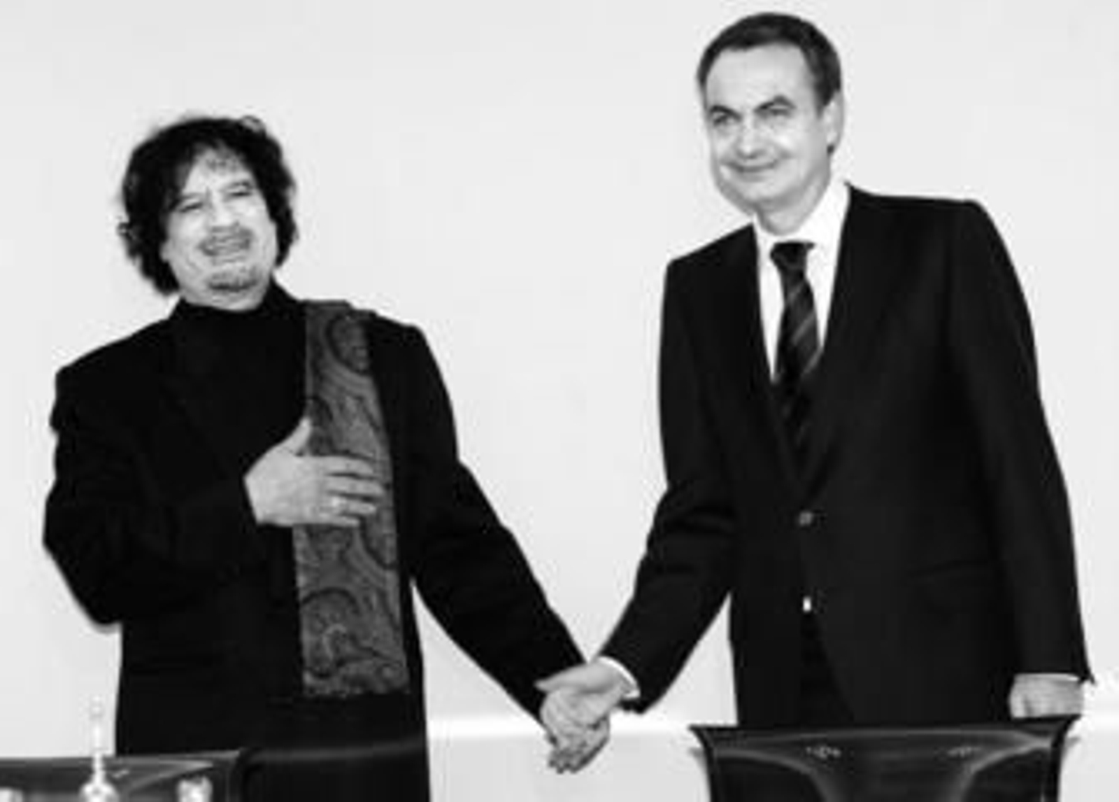El guía supremo de la Yamahiria Árabe Libia Popular Socialista, en el poder desde 1973, fue recibido en La Moncloa por el presidente del Gobierno, con el que departió a solas durante 40 minutos, antes de reunirse las respectivas delegaciones en las que, por parte española, estaban los ministros Pedro Solbes y Miguel Ángel Moratinos.
