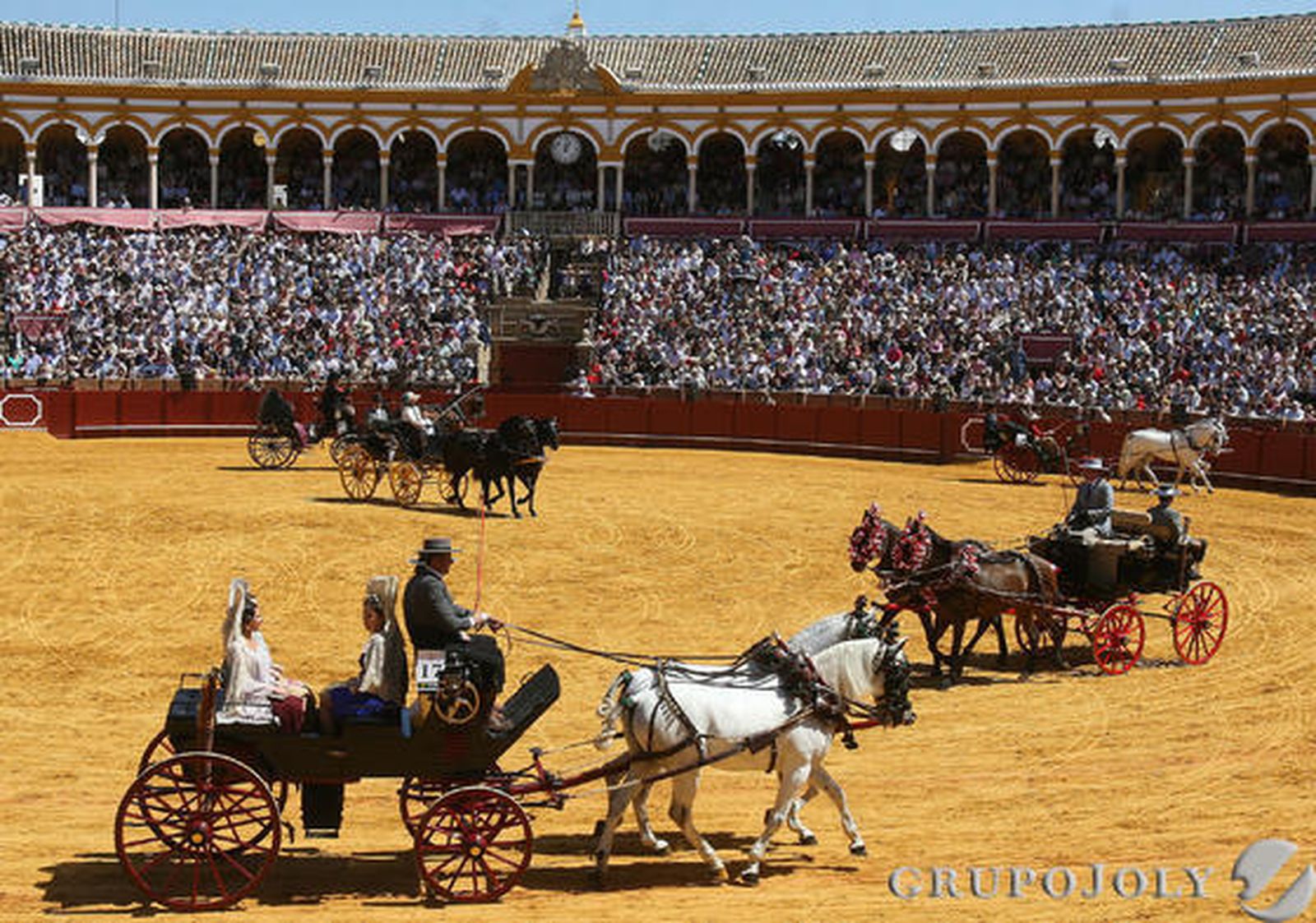 El espectáculo comenzó a las doce del mediodía con los primeros carruajes de protocolo. El desfile dedicado a Colombia contó con Marina Danko como madrina de honor. Veinte bailarines colombianos de la agrupación Carnaval de Barranquilla en Barcelona ofrecieron una nota de color a través de dos números de baile que dieron paso a la exhibición ecuestre. Ocho tandas y cada una reunió a alrededor de nueve carruajes, la antesala de los paseos a caballo de la Feria, a punto de comenzar. Entre los primeros que pisaron el coso destacó el número 11, un carruaje procedente de Italia, que arrancó el aplauso del público en varias ocasiones. Un modelo que fue utilizado en otra época como coche de carreras concentró las miradas en la Maestranza por la agilidad de su cochero y la belleza del paso de su caballo.