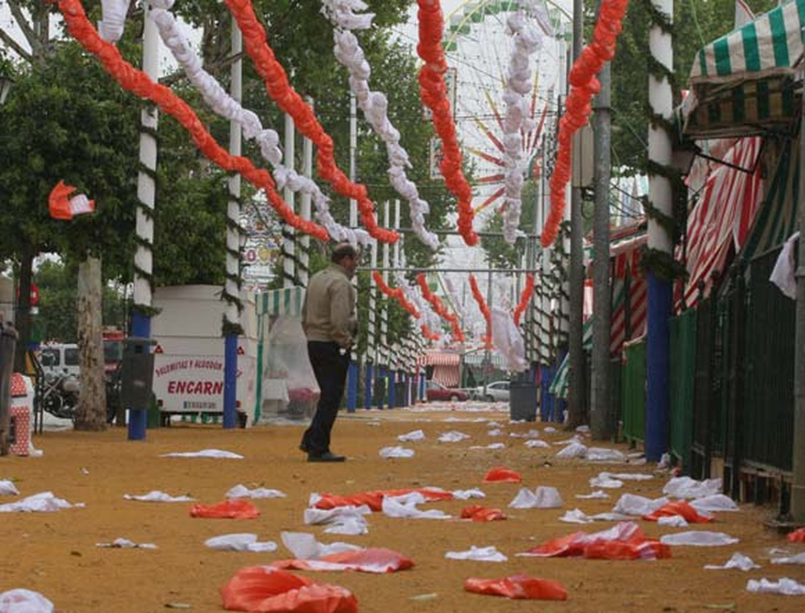 Pese a la reserva precisada por parte de la fecha y de las previsiones de fuertes lluvias y vientos en estos días de feria, la concejal de Fiestas Mayores del Ayuntamiento de Sevilla, Rosamar Prieto-Castro, explicó que los operarios tardan cinco días en reponer estos ornamentos cuando quedan "mojados y colgando", por lo que "si llueve la reposición con la Feria funcionando es muy difícil".