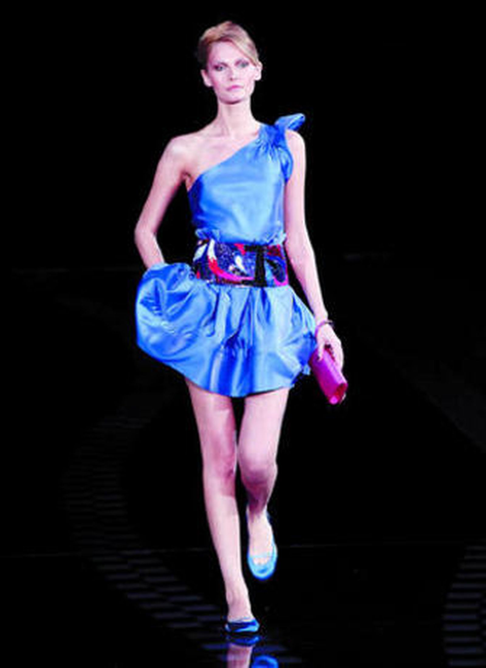 Armani renueva su imagen y la moderniza con llamativos contrastes cromáticos y líneas ochenteras, muy juveniles. Atrás deja sus creaciones en tonalidades neutras y cortes clásicos, aunque no las olvida por completo, pues las recupera en los primeros looks de su desfile. Los colores que imperan son el verde, azul, fucsia y naranja así como los estampados geométricos y de grandes flores. Vestidos con faldas de volantes, ceñidos a la cintura y un solo tirante; chaquetas con hombros redondeados muy marcados... en general, diseños muy entallados en el cuerpo, que recuperan volúmenes en la zona de las caderas.