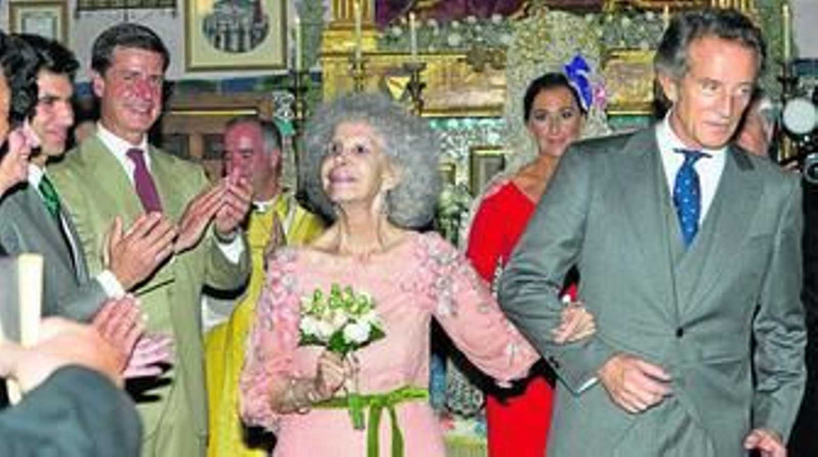 Una ceremonia religiosa de una hora que fue muy intensa, celebrada por tres sacerdotes, con salve rociera incluida. Pero como en toda boda, ella era la gran protagonista. Ella, y todo lo que la rodeaba: su traje rosa de Victorio y Lucchino, sus zapatos de Pilar Burgos, sus sencillos complementos y, sobre todo, su felicidad. No fueron un inconveniente ni sus 85 años, ni el público multitudinario ni, sobre todo, los medios de comunicación. Es más, con su actitud, la duquesa parecía querer gritar al mundo entero que, tras todos los avatares pasados, se había convertido, unos minutos antes, en una mujer casada. Eran algo más de las dos del mediodía y la emocionante estampa se producía cuando ambos contrayentes ya se habían dado el sí, quiero.