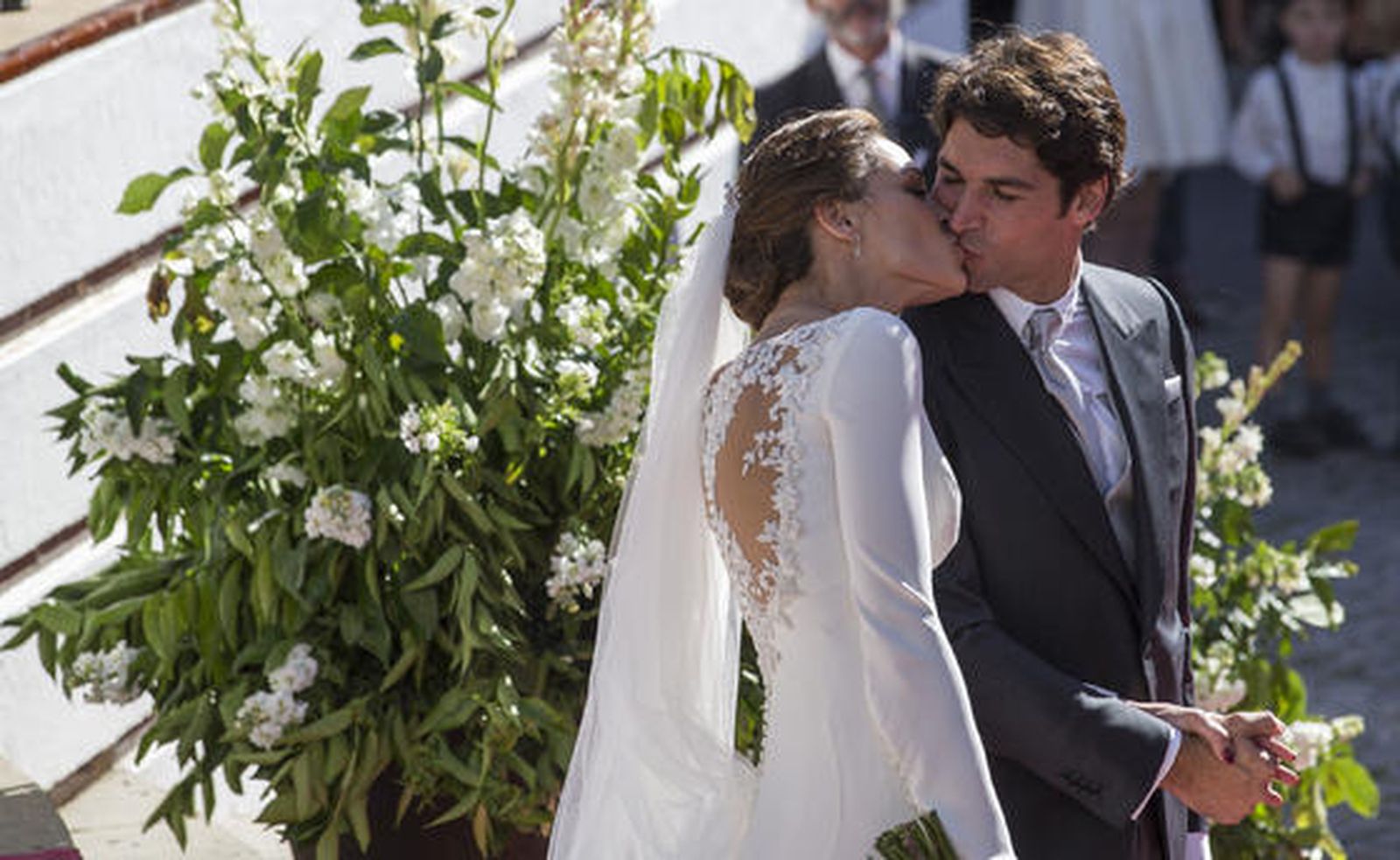 El torero y la modelo protagonizan una ceremonia clásica con Rolls, chaqués, guantes y pamelas, en la que el novio fue de azul y la novia, muy sencilla, con un velo eterno y la espalda bordada.