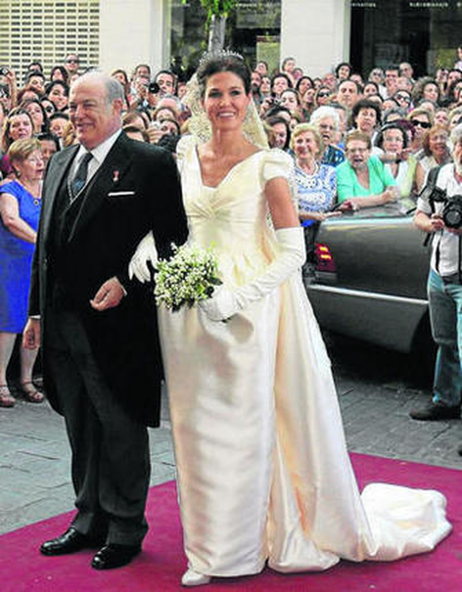En cuanto al secreto mejor guardado, el traje nupcial, se trataba éste de una apuesta en blanco roto exclusiva también de V&L inspirada en Zurbarán y realizada en dupión de seda con manga tulipán, escote drapeado y cola abullonada. Un hermosísimo conjunto rematado con guantes y una mantilla del siglo XVIII recogida en la espalda con un gran broche de brillantes a juego con la diadema y los pendientes que, cedidos por el mencionado padrino, hicieron brillar a la novia con luz propia.