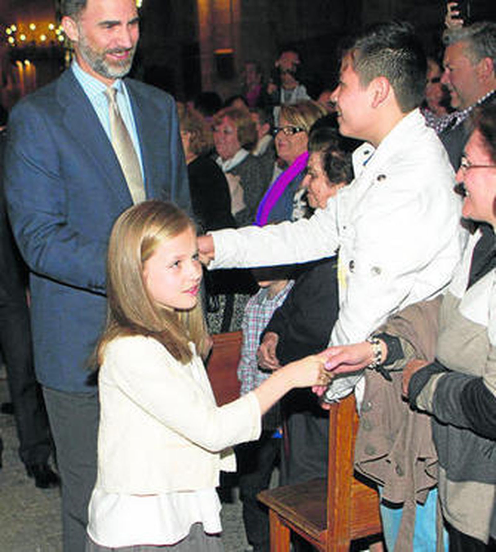 Los Reyes y sus hijas posaron unos minutos ante los numerosos fotógrafos y cámaras apostados a las puertas del templo, saludando al público, como también hicieron personalmente a los feligreses en el interior del templo. Doña Leonor también se estrenó en la misión protocolaria de dar la mano a los asistentes, muy cerca de sus padres, sonrientes ante la perfecta actitud de la princesa.