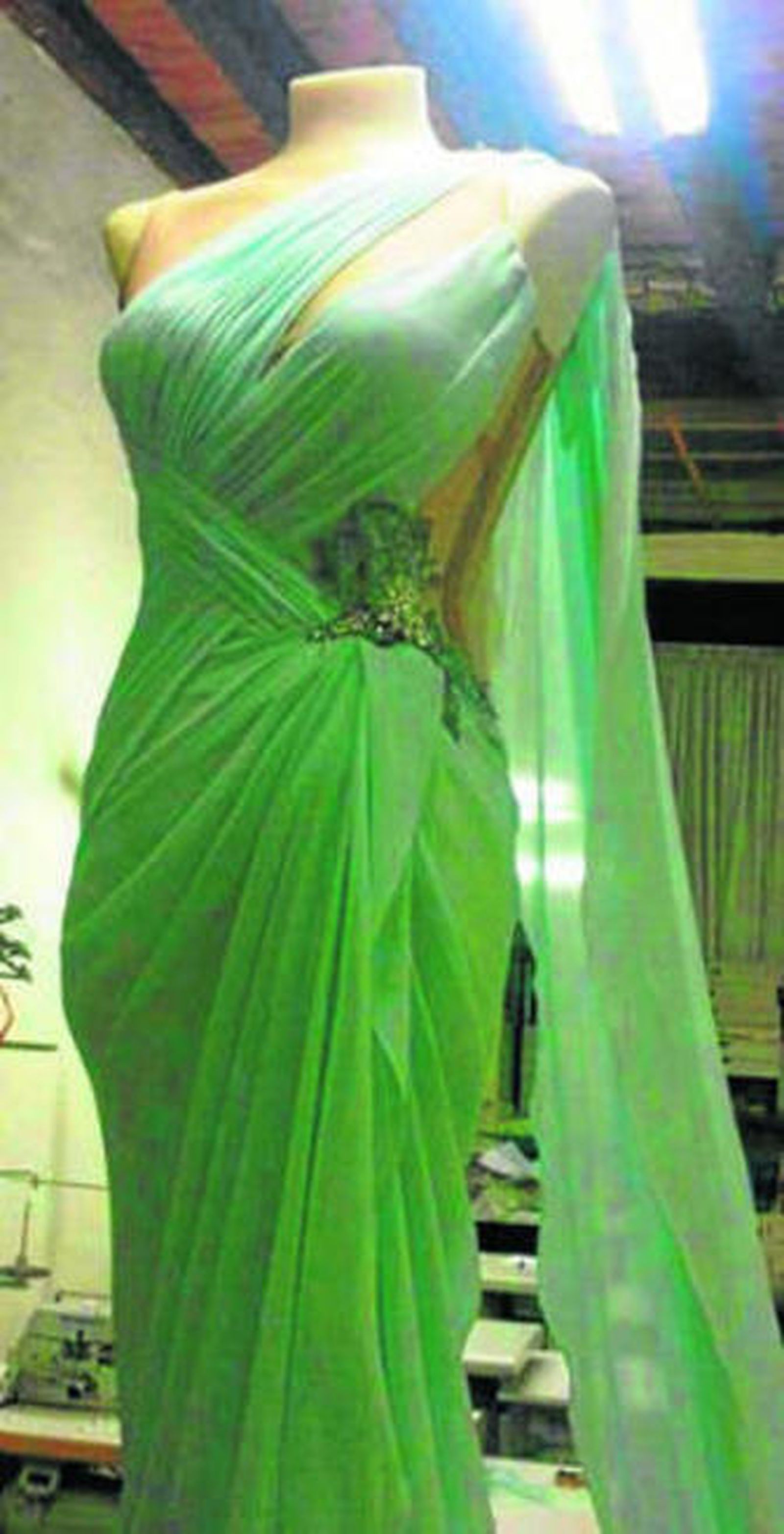 -Es de seda natural y se han empleado veinte metros de gasa. Va aderezado con un juego de aplicaciones bordadas por Francisco Carrera Iglesias, Paquili, en cristal de Swarovsky, siguiendo los cánones de costura tradicional. Aparte, lleva un gran escote en la espalda y otro muy original en la parte delantera y va drapeado sobre el cuerpo sin una base sólida. En cuanto al color, verde aguamarina.