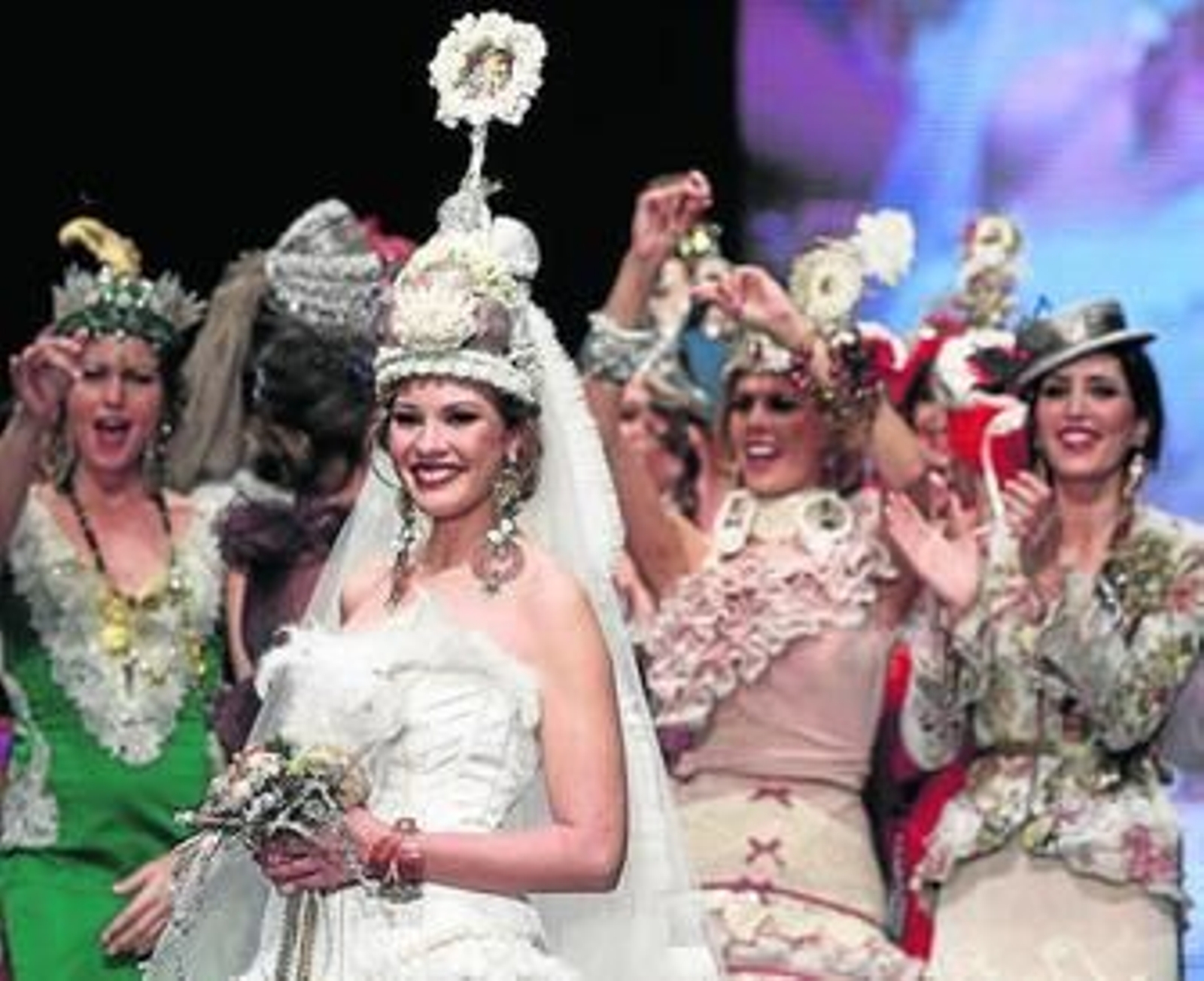 Ya por la tarde, Rosalía Zahíno contentó a quienes se quedaron con las ganas de su boda casando a la mencionada Jessica Bueno en una fiesta gitana que abrió un pase lleno de sorpresas. Un espectáculo donde nada faltó: volantes redondeados, plisados o en caracola, plumas en cuerpos negros, terciopelos con mangas ceñidas, pantalones de lunares, corpiños… Por si fuera poco, Encarna Solá desplegó un amplio abanico de grandes peinas o tocados con frutas con los que gritó aquello de "¡la imaginación al poder!". Por su parte, Ángeles Verano se distanció de sus tradicionales pasteles y estampados -presentes pero menos- saliendo reforzada con rojos, naranjas, morados y turquesas que defendían una mujer serena y elegante enmarcada por tirantes o mangas cortas y suaves caídas. Muy destacable su negra bata de cola con transparencias en la cintura y acaracolados remates en los bajos y los zapatos de la estilosa Nuria Cobo. Nuevo Montecarlo desplegó sutileza con los canasteros en una sutil línea en azules, rosas y beiges que incluyó un guiño a lo infantil y donde se emplearon los linos, el popelín y el piqué y Luchi Cabrera contentó a todas las miradas con una colección en la que se dio cabida a lisos y estampados, a escotes más o menos pronunciados y a espaldas sinuosas, mangas trabajadas, verdes con el reverso en rojo… Eso sin dejar atrás unos magníficos complementos, en dorado y plata, inspirados en antiguos tesoros que, en sí mismos, constituían una auténtica joya.