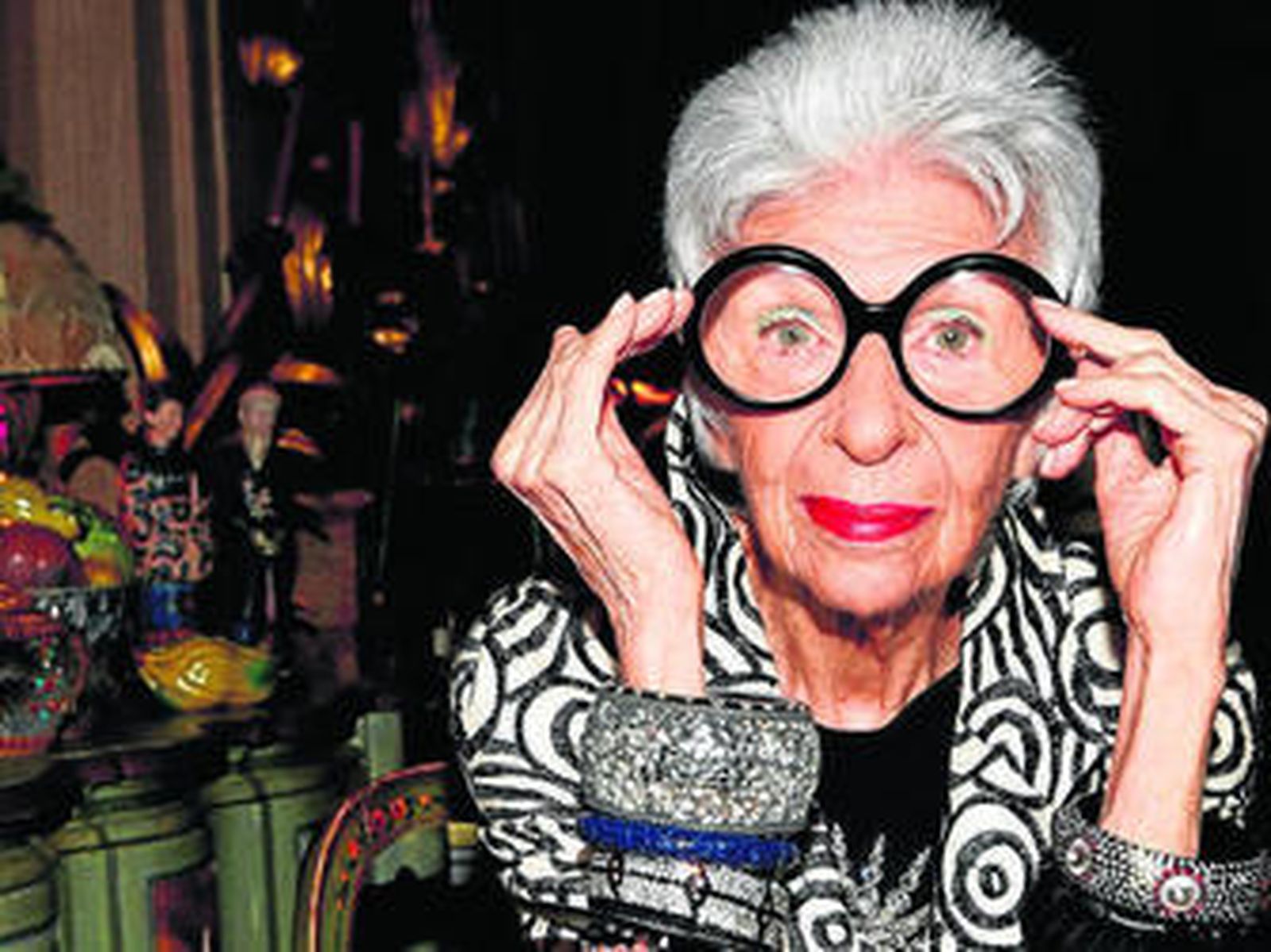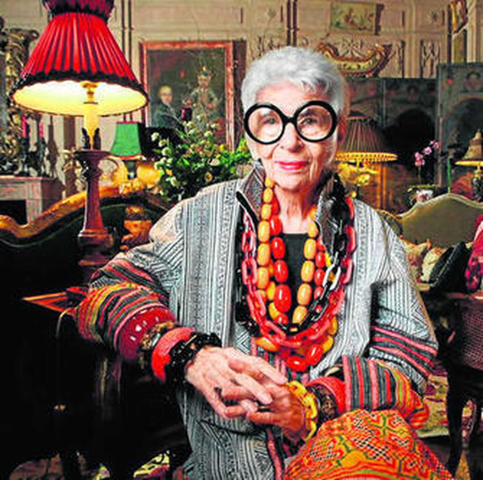 A sus 91 años , Iris Apfel sigue trabajando como cuando tenía 30. Esta decoradora, además de diseñadora de gafas, bolsos y zapatos, se mantiene en la cúspide del mundo de la moda y últimamente ha copado muchas páginas de revistas europeas a raíz de la exposición que hizo de su ropa en el Museo de Arte Metropolitano de Nueva York. Nació en la época de La Gran Depresión y sus padres le inculcaron el valor del estilo y del dinero, de modo que desde bastante pequeña tuvo que elegir sus propios modelitos ajustándose a la economía familiar. Adora el mundo de la moda y siempre ha estado vinculada a él. Ha ido coleccionando prendas de prestigiosas firmas que casaban con sus gustos y que los diseñadores no deseaban tener más tiempo en sus colecciones. En su armario se pueden encontrar piezas de diseñadores como Dior, Nina Ricci y Dolce & Gabanna, entre otros, pero si hay algo que Iris ha considerado fundamental a la hora de vestir han sido los complementos.