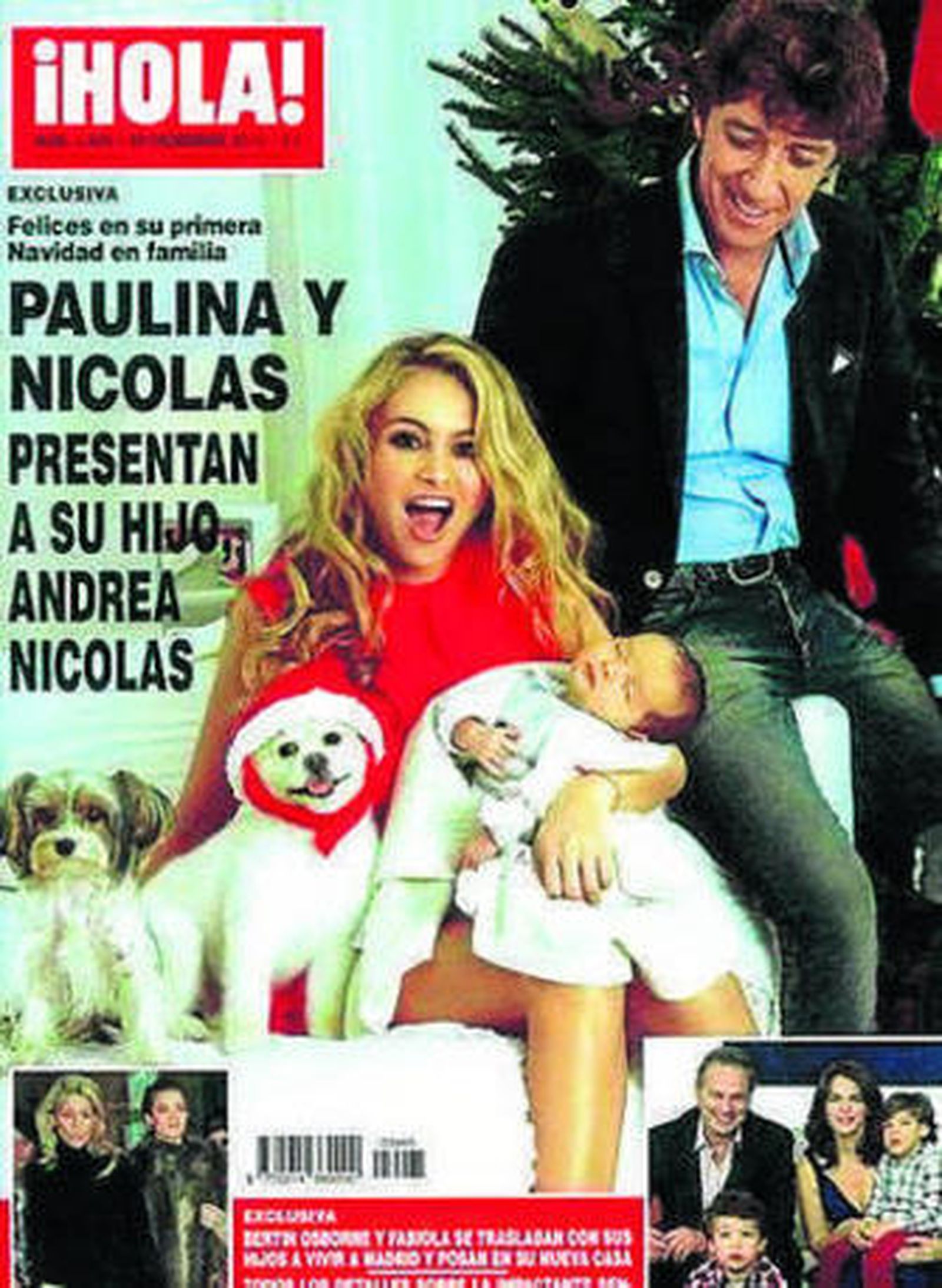 Paulina Rubio y Colate son todo felicidad, y así lo han querido mostrar en la portada de ¡Hola! de esta semana. Los recién estrenados papás -que el mes de mayo anunciaron en la misma revista que estaban en la dulce espera- han vuelto a confiar en la publicación para presentar a su bebé de poco más de un mes, Andrea Nicolás. Un amplio reportaje, impregnado del clima navideño propio de estos días, del que llama la atención algunas de sus imágenes. Concretamente, la que la revista ha escogido para su portada, que presenta a la familia con el pequeño Andrea en los brazos de su madre -que una vez más posa con la boca abierta- y uno de sus perritos con un simpático gorrito de Navidad. ¿Estaría Paulina dando alguna instrucción al fotógrafo o quizás diciendo 'patata'? En el generoso espacio que la revista dedica a la pareja no se han detenido a explicarlo... Una pena.