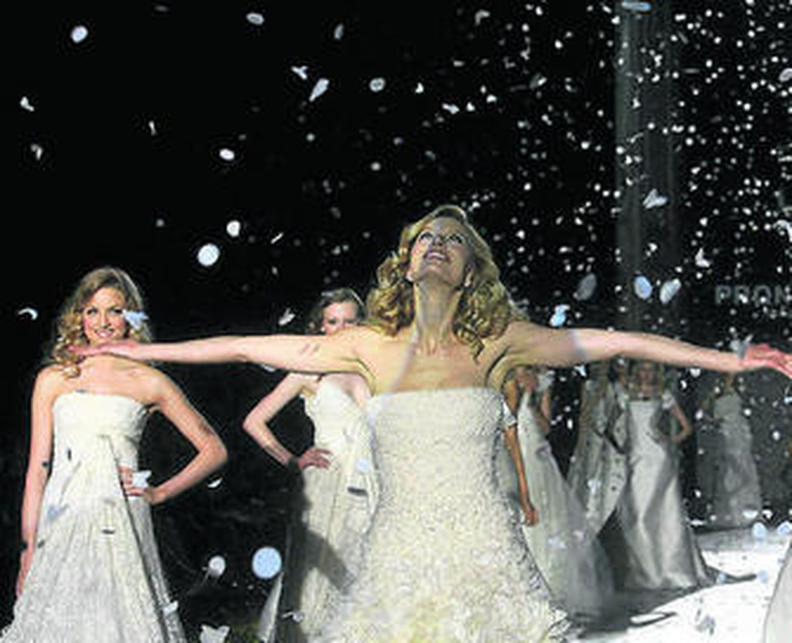 Muchos rostros famosos respaldaron el desfile final de la Pasarela Gaudía Novias, que cerró la firma Pronovias. La top model Karolina Kurkova, con un vestido palabra de honor muy ajustado al cuerpo y una falda cuajada de pétalos y rosas de gasa, obra del equipo de creadores que dirige Manuel Mota, abrió el desfile junto a las modelos Raica de Oliveira, Toni Garrn y Michaela Kocianova. Los creativos de Pronovias proponen para este año ondulaciones y volúmenes de tul con plumas, gasa, chiffon de seda y gasa plisada, pero también trajes más convencionales de tejidos como la organza, el brocado, el raso y el encaje. La ambientación la formaba un jardín.
