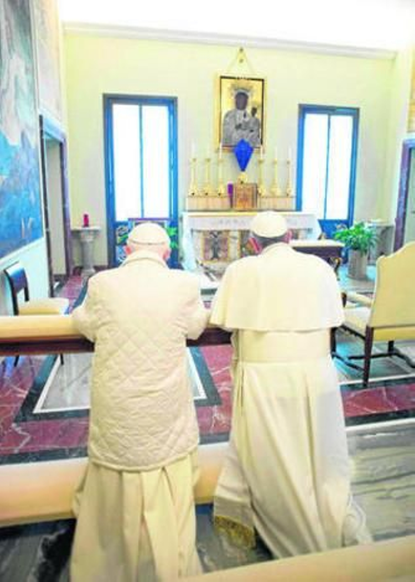 Por primera vez en la historia de la Iglesia, al menos desde que se tienen referencias escritas, un papa en plenos poderes y otro emérito se reunieron, se fundieron en un abrazo y rezaron juntos "como hermanos". Un encuentro inédito que protagonizaron ayer el papa Francisco y el pontífice emérito Benedicto XVI.