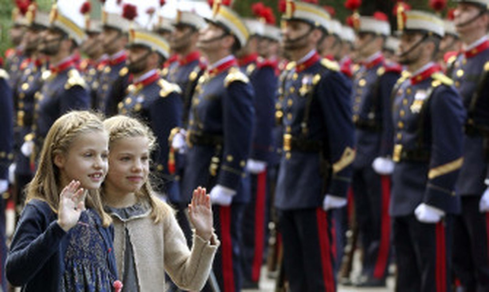 Las dos niñas estuvieron en todo momento muy atentas al desfile militar, aunque no pudieron evitar los gestos de espontaneidad, sobre todo, cuando vieron pasar a la cabra de la legión, que provocó en ellas sonrisas y miradas de complicidad.