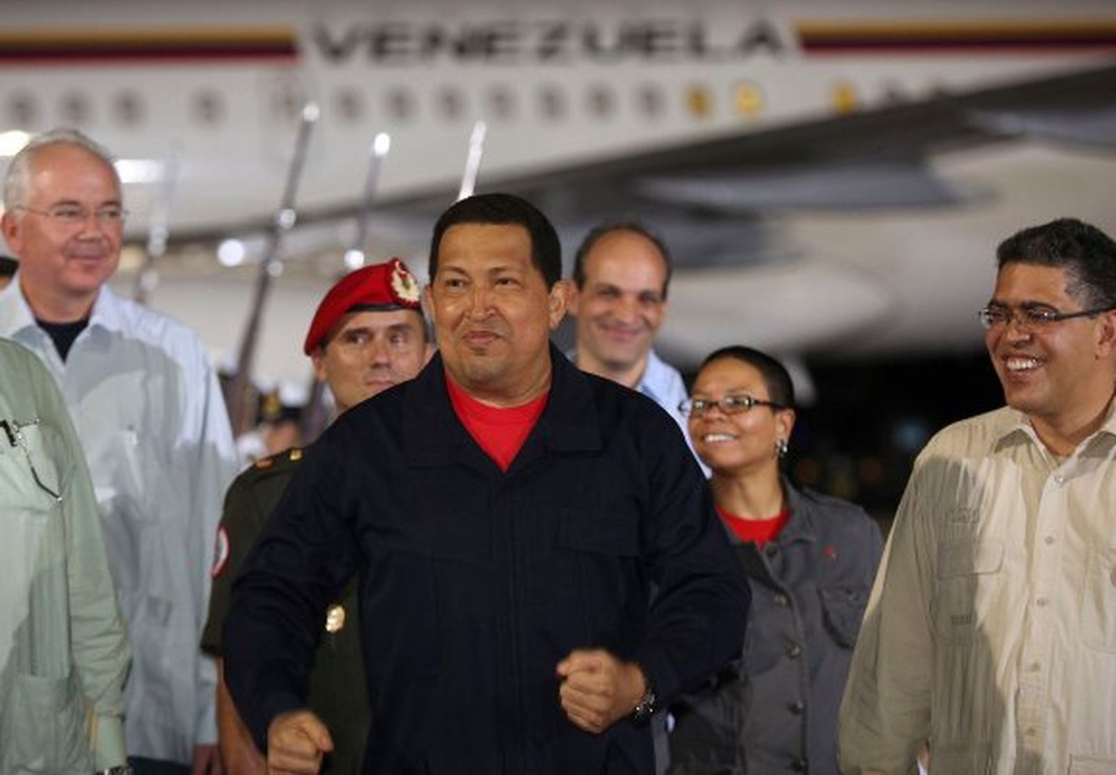 Vestido con camisa azul y camiseta roja, un Chávez de buen semblante conversó con el grupo de cadetes de marina que formó la guardia de honor que recibió al presidente. Chávez llegó acompañado del ministro de Exteriores, Nicolás Maduro, y el de Energía, Rafael Ramírez, y conversó en la misma pista del aeropuerto con varios de los miembros de su Gabinete, que se desplazó al completo a Maiquetía para recibirlo.