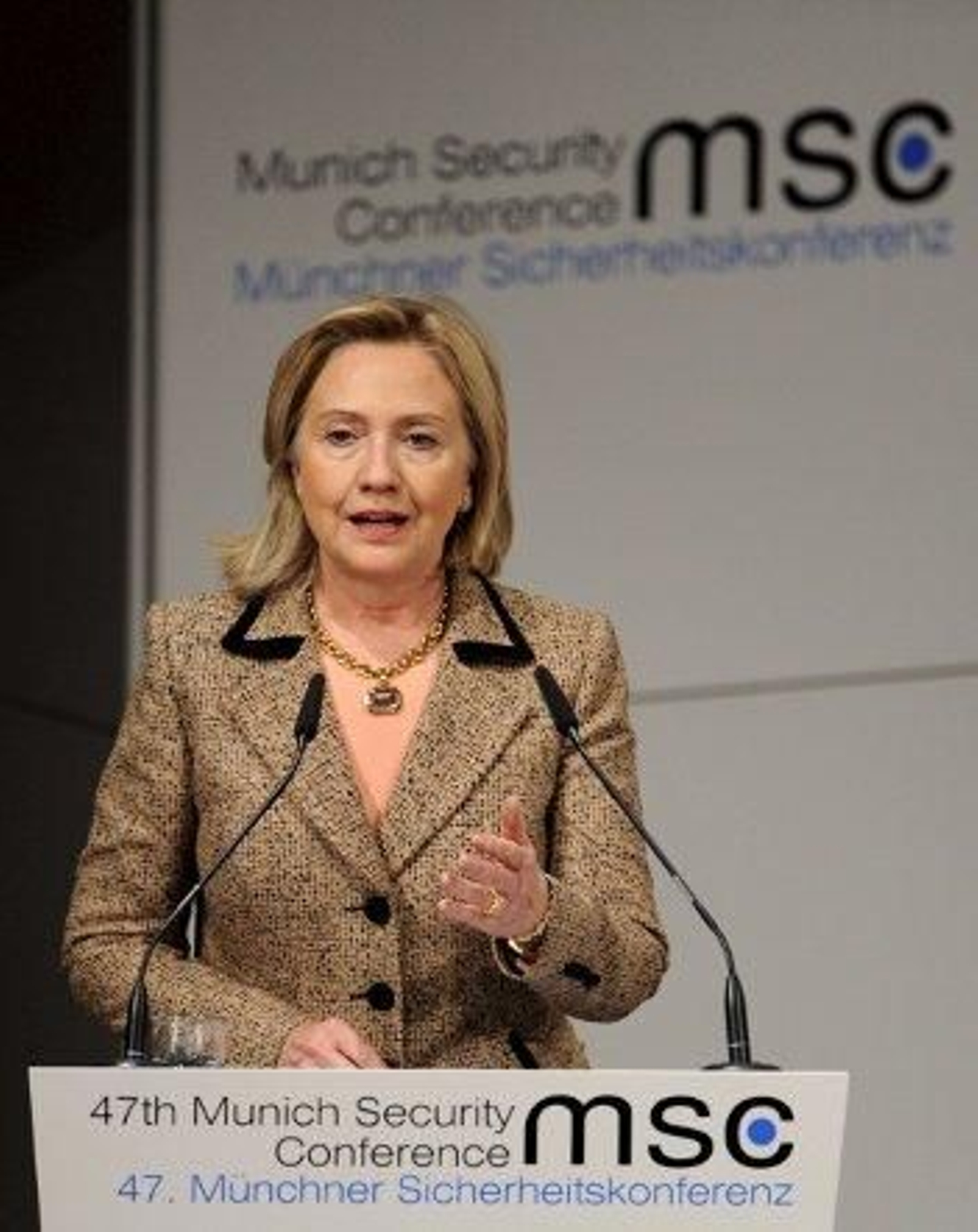 La responsable de la política exterior de Estados Unidos subrayó que "sin progreso serio hacia una sociedad abierta", "sin unas mejores condiciones económicas que suelen ir unidas a la democracia", la distancia "que separa al gobierno y los gobernados crecerá". Hillary Clinton afirmó que las sociedades árabes cuyo "desafío principal sea un futuro mejor en el que se respeten los derechos fundamentales" cuentan con el respaldo de Estados Unidos. Igualmente, Clinton advirtió a los presentes en Múnich que es importante solucionar las revueltas en las sociedades árabes, principalmente en Egipto, porque "en Oriente Próximo todo está interconectado".