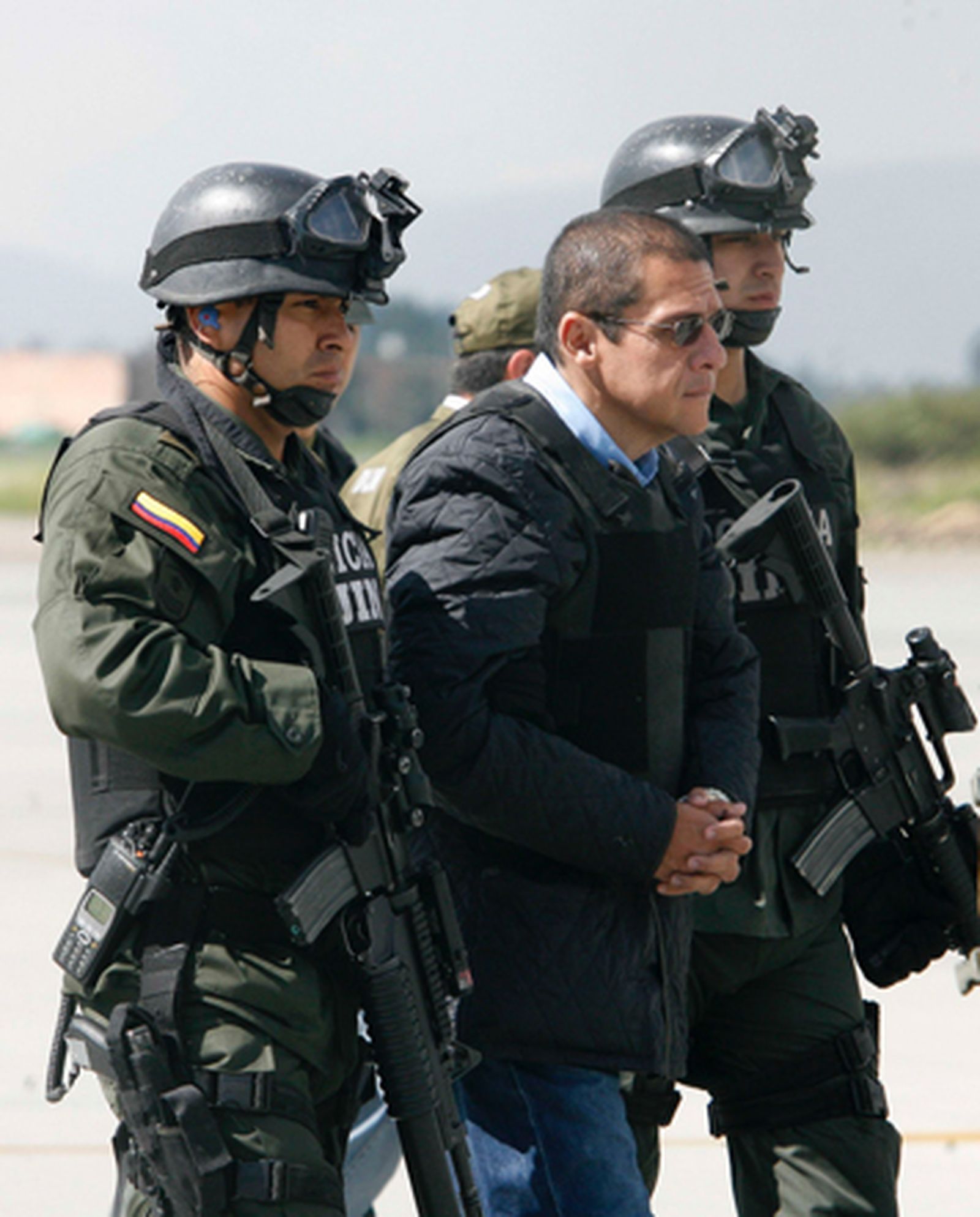 Al llegar al hangar de la Policía Antinarcóticos en el aeropuerto de Bogotá, "Don Diego" iba esposado, con un chaleco blindado y caminaba cabizbajo rodeado de un comando de policías de asalto que lo entregaron a los delegados de la DEA.