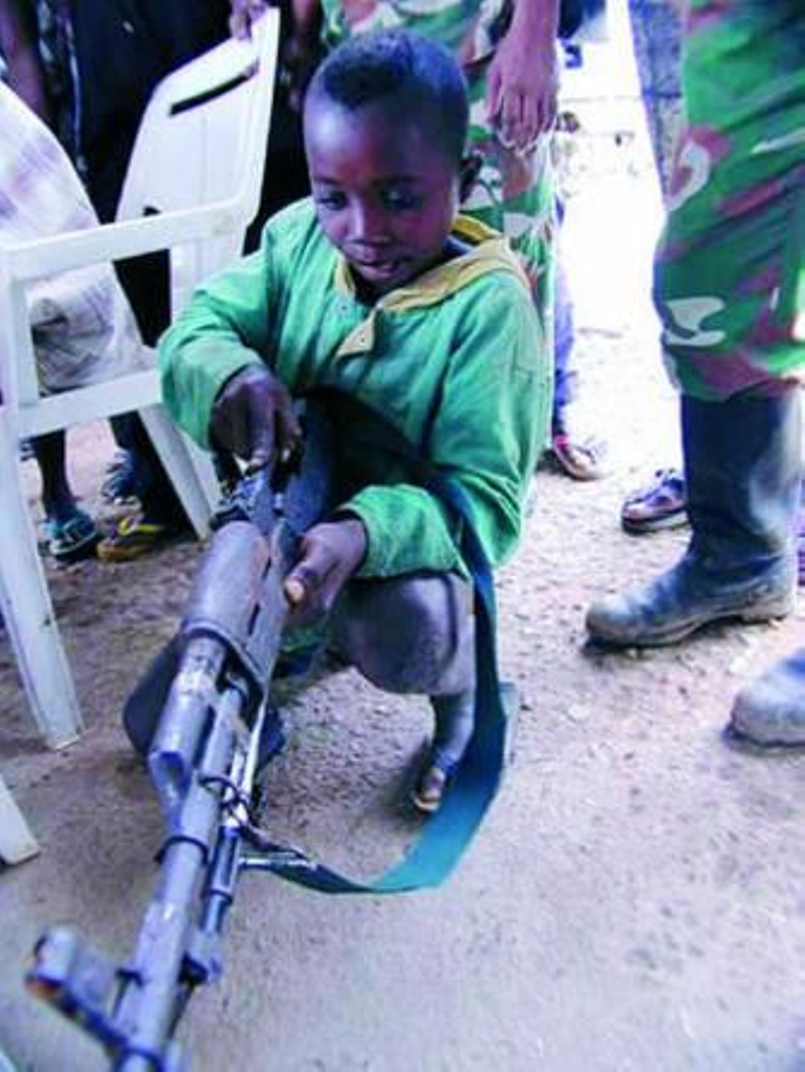 En 2005, los rebeldes atacaron su pueblo en mitad de la noche. A él y a otros cuantos niños más les ataron las manos y los llevaron a otro pueblo. Mientras les propinaban patadas fueron advertidos de que, a partir de ese momento, serían soldados y tendrían que luchar junto a ellos.