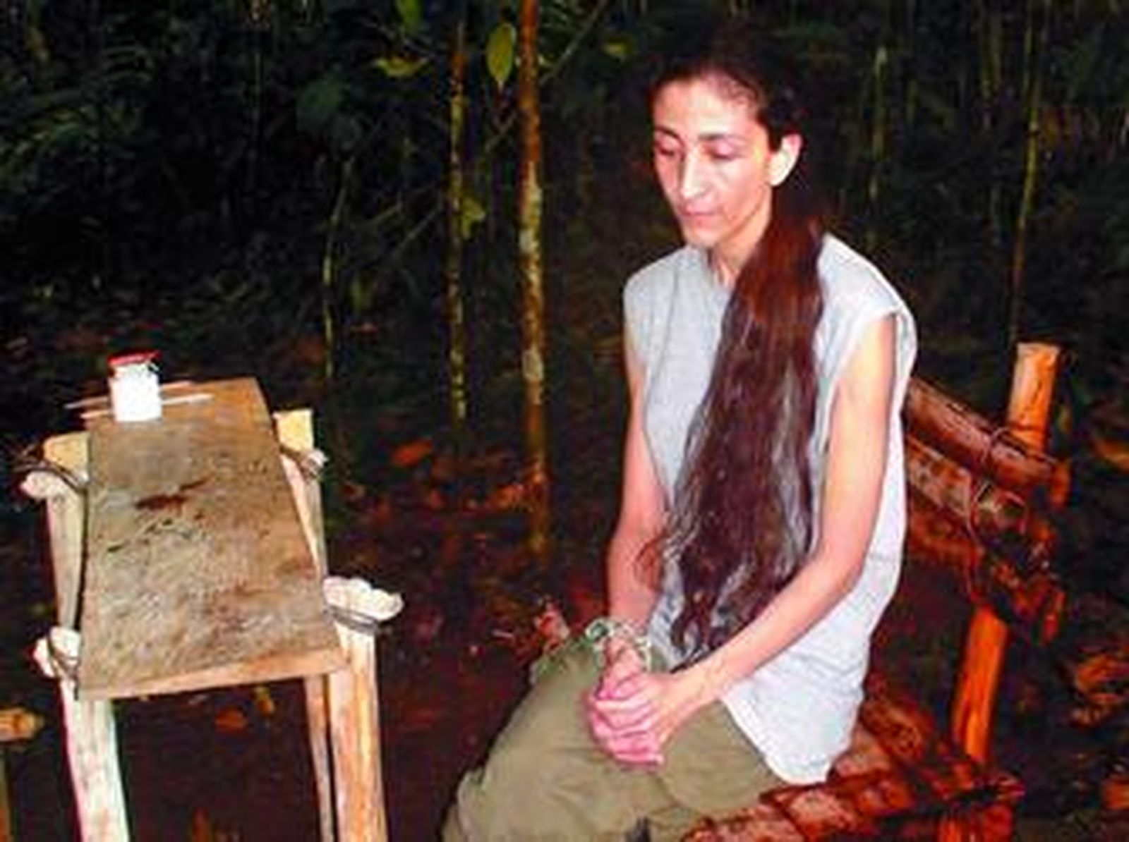 Sentada, con las manos unidas y la mirada baja al frente de unas rústicas tablas que pretenden ser una mesa. La extrema delgadez deja entrever la difícil vida en la selva. Así es la imagen que se conoció ayer de la ex candidata presidencial colombiana Ingrid Betancourt, que es rehén de la guerrilla de las FARC desde febrero de 2002.