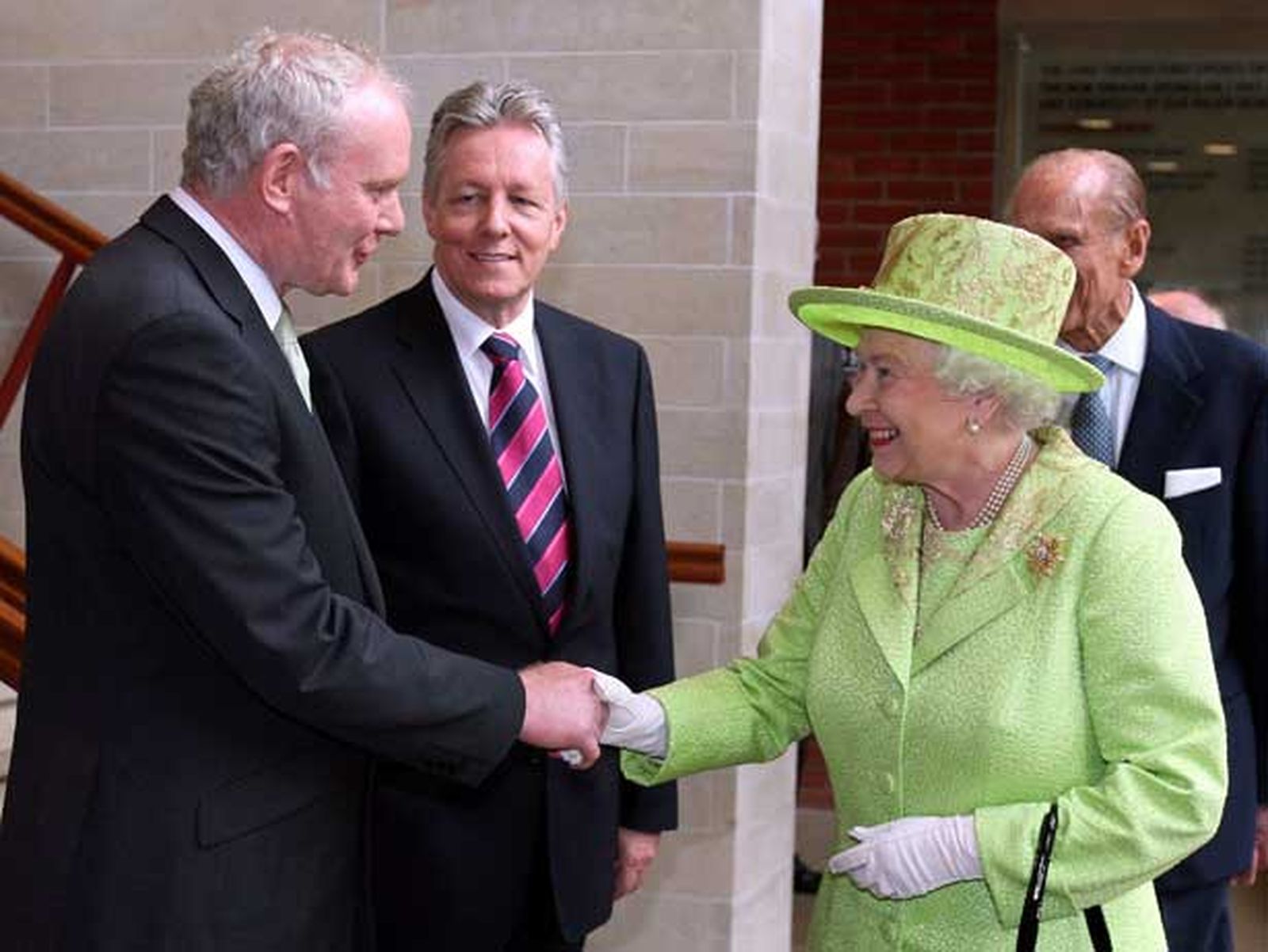 Este gesto certifica el éxito del proceso de paz y sella la reconciliación entre dos antiguos enemigos, representados por la soberana y el ex dirigente paramilitar, símbolos del vínculo de la provincia con el Reino Unido y de la oposición a la presencia británica en Irlanda del Norte, respectivamente. También estuvieron presentes, entre otros, el ministro principal norirlandés, el unionista Peter Robinson, y el presidente de la República de Irlanda, Michael D. Higgins, así como los artistas locales Barry Douglas, Michael Longley, Adrian Dunbar y Conleth Hill. Después, esta comitiva recorrió las instalaciones del Teatro Lírico de Belfast para comentar varias obras de arte con Isabel II, que para la ocasión, eligió un abrigo, traje y sombrero verdes, el color de Irlanda, a juego con la corbata del nacionalista McGuinness.