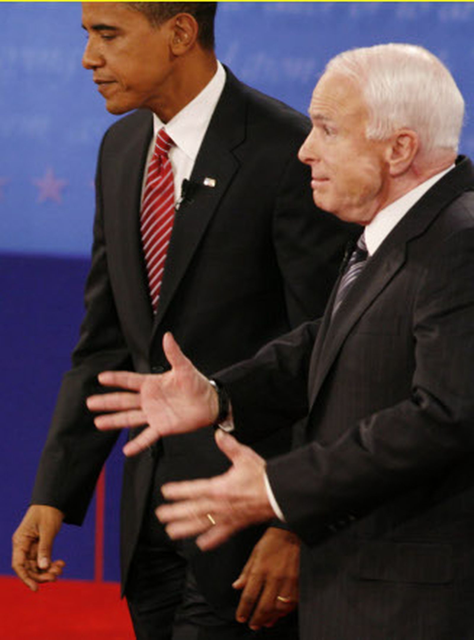 "He estado en desacuerdo con las políticas de Bush en lo que se refiere a cambio climático, a la guerra de Iraq, al uso de los sistemas para financiar el empleo de fármacos y respecto a la comisión de investigación para estudiar el 11 S. Me he enfrentado a Bush en todos estos aspectos, no como Obama", explicó McCain.