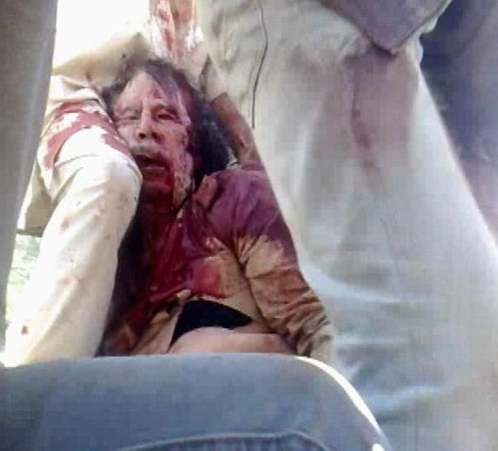 La cadena Al Arabiya difundió unas imágenes del escondite. Otro testigo de la captura explicó a la cadena británica que el antiguo líder se ocultaba junto a sus guardaespaldas y su jefe de seguridad, Abu Bakr Yunos Jabar. La operación se produjo en torno a las 12:30. Unas horas después, Abdul Hafiz Ghoga, vicepresidente del CNT, proclamaba el fallecimiento del coronel: "Anunciamos al mundo que Muamar el Gadafi ha muerto a manos de los revolucionarios". La televisión qatarí Al Yazira respaldó la información con unas imágenes exclusivas que enfocaban el cuerpo del libio, inerte y ensangrentado, yaciendo en el suelo.