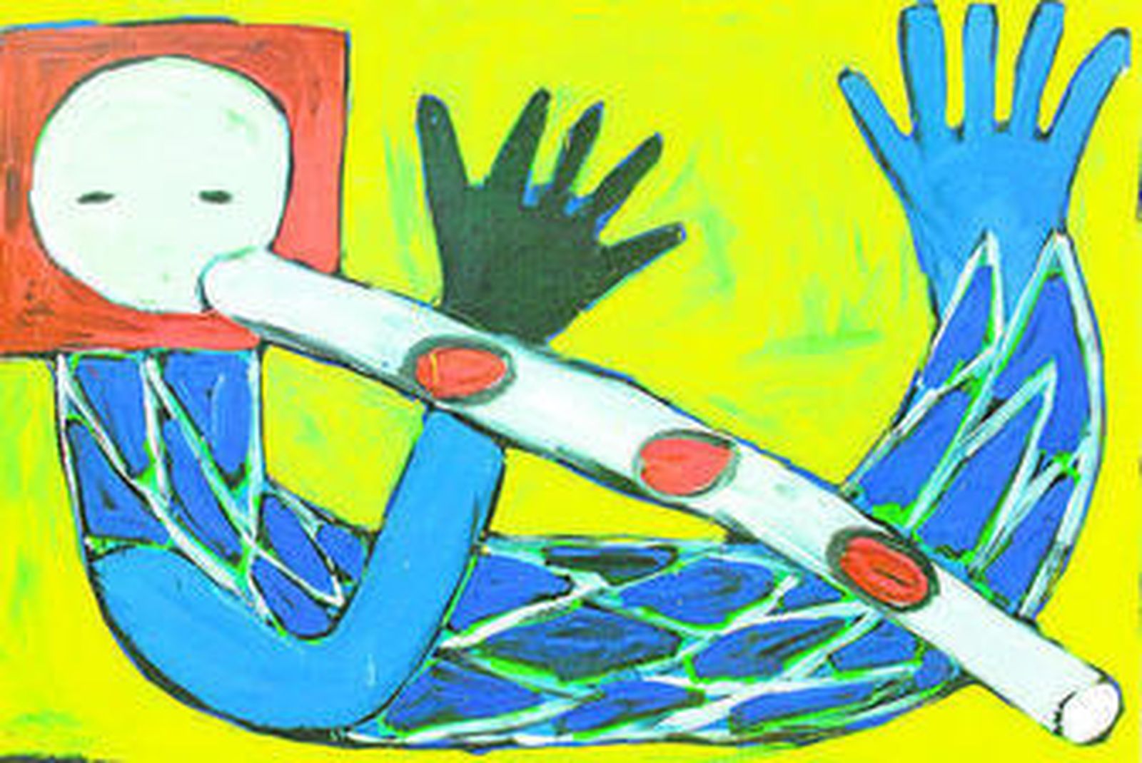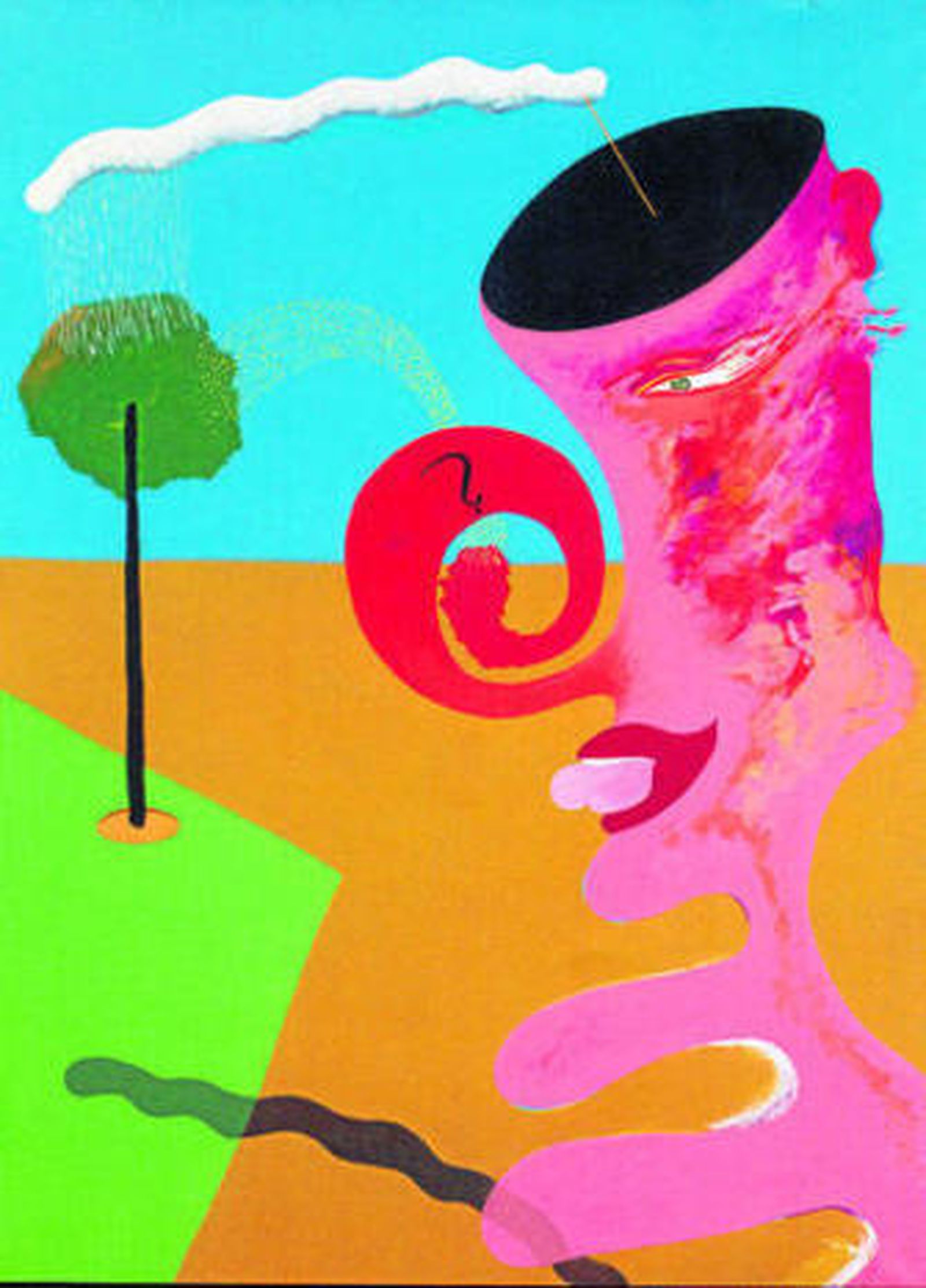La fiebre del heno, el cuadro de Carlos Alcolea (La Coruña, 1949-Madrid, 1992), parece presidir la muestra. Colores intensos que rozan conscientemente el kitsch y buenas dosis de humor: ¿por qué, si no, elevar al lienzo la molesta prosa de una alergia de primavera? Hubo muchas cosas en los años 80 en el arte español pero sin duda la llamada Nueva Figuración abrió caminos. Se advierte especialmente en las piezas hechas en esos mismos años, como ocurre con la obra de Alcolea y también con las tres piezas de Manolo Quejido (Sevilla, 1946): el autor, tras unos años indagando mediante la informática alternativas de la forma, pasó a investigar los límites de la pintura en un ejercicio diario sobre cartulinas de 100x70 cm. Algunas de las figuras así generadas las convertirá en símbolos, como la máquina de escribir: esta metonimia del escritor Quejido la transforma en metáfora del trabajo del pintor, porque pintar es pensar y proyectar, esto es, maquinar.