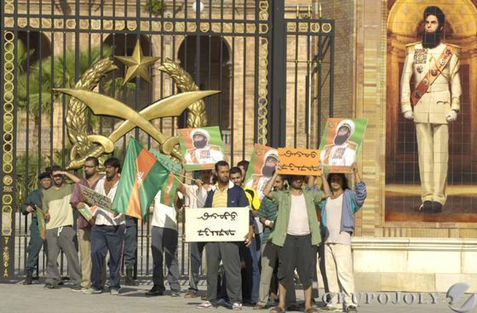 Quien caminara ayer por la Plaza de España pudo ver los carteles que la productora de El dictador había colocado por todo el perímetro: "Paramount Pictures Corporation está rodando en esta zona. Su presencia aquí constituye su consentimiento para ser grabado tanto para la película como para propósitos comerciales. Si no desea aparecer en tal grabación y necesita estar en esta zona, por favor diríjase a la organización". Todo listo, pues.