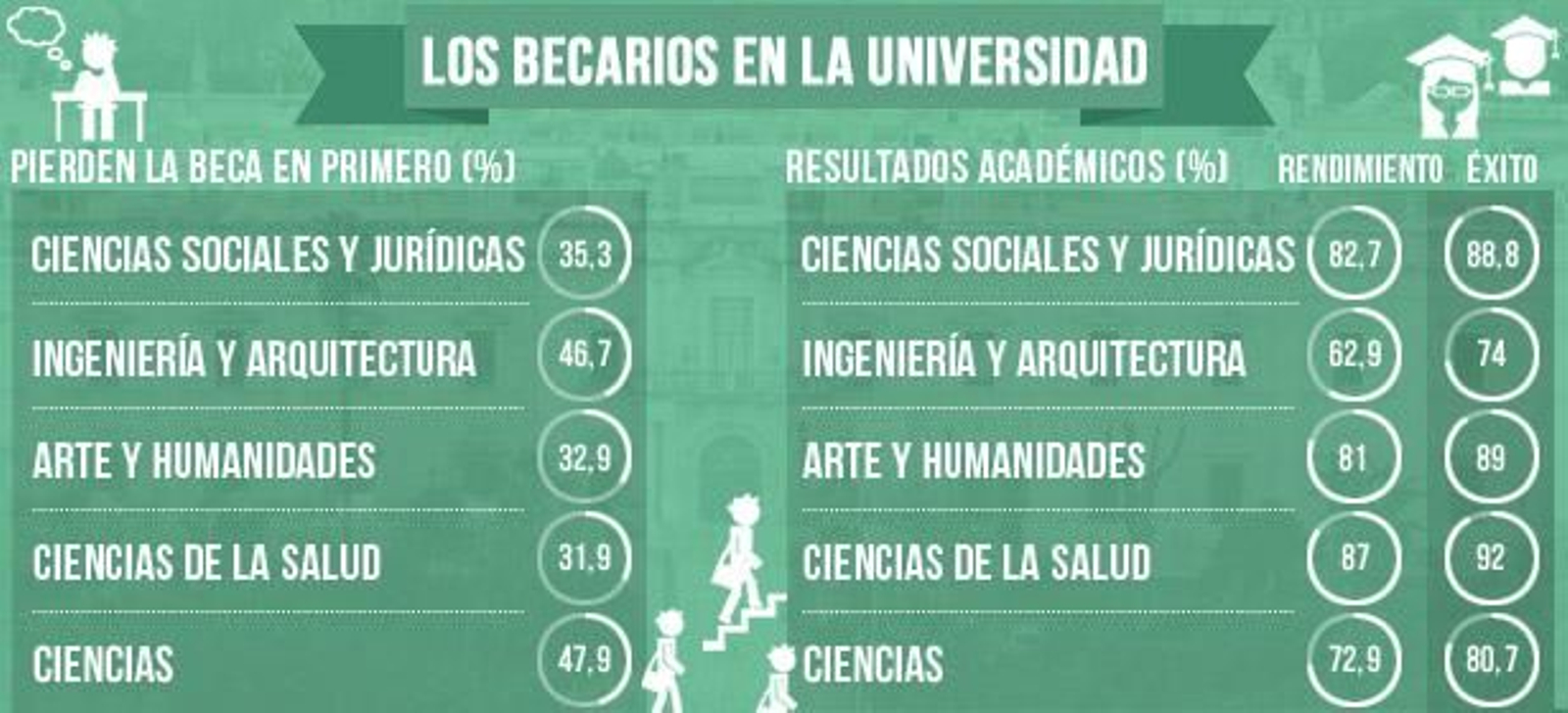El informe del Ministerio de Educación Datos básicos del sistema universitario español del curso 2013/2014 pone de manifiesto que el porcentaje de alumnos de nuevo ingreso que llega a la universidad con beca alcanza el 41%. Sin embargo, en gran medida a consecuencia del importante descalabro que se produce en primero, los becarios en la universidad únicamente suponen el 22% del total en España (28% en Andalucía). El informe del Ministerio de Educación alude al rendimiento académico como principal causa de la pérdida de las ayudas. Estos datos corresponden al curso 2011/2012, cuando únicamente se pedía haber aprobado el 80% de los créditos en todas las titulaciones, salvo en ingeniería y arquitectura donde era suficiente superar el 60%. Todos los indicios apuntan que estos datos irán aún a peor porque los requisitos académicos se han endurecido y ahora es necesario tener todo aprobado o que la nota media sea al menos de 6,5 y tener el 90% de los créditos superados en las titulaciones de humanidades, ciencias sociales y ciencias jurídicas. Este porcentaje baja al 80% en el caso de ciencias y ciencias de la salud y al 65% en las ingenierías.
