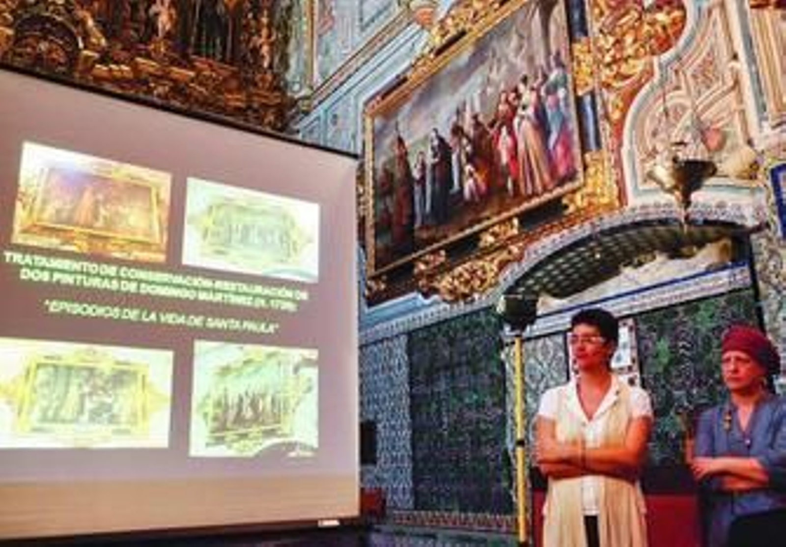 Ambas pinturas, que representan sendos episodios de la vida de Santa Paula, han sido sometidas durante dos años a los trabajos de restauración dirigidos por las conservadoras María Arjonilla Álvarez y Mercedes González Fuentes, quienes ya habían intervenido en la pintura mural de San Cristóbal que esta misma iglesia conserva junto a las rejas del coro.