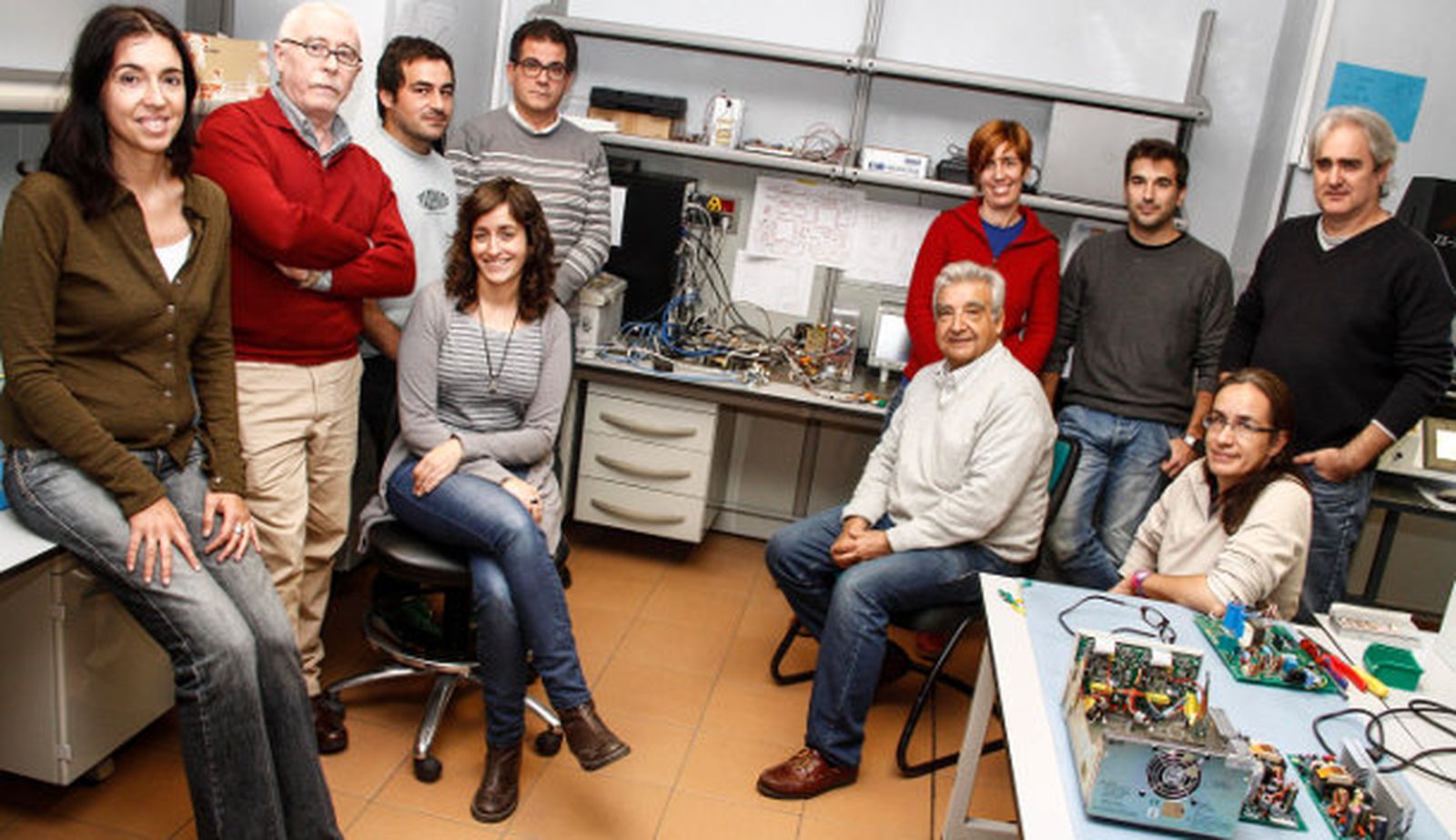 El equipo que lidera José Juan López-Moreno (sentado) en el Instituto de Astrofísica de Andalucía, junto a un modelo de electrónica que han desarrollado para simular el Nomad a bordo del 'rover' Exomars. / ALEX CÁMARA