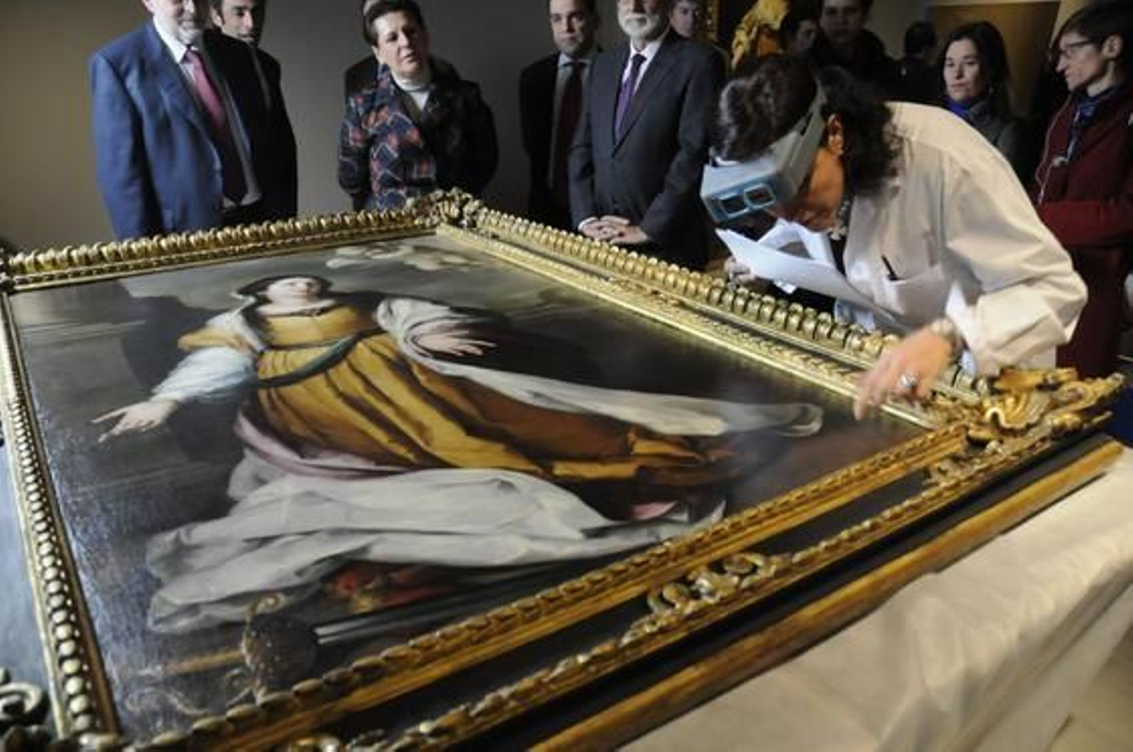 La minuciosidad, el protagonismo de esos pliegues quebrados de la túnica, es una de las señas de identidad de una pintura que, procedente del Bellas Artes de Bilbao, llegó a Sevilla inserta en una caja especial con varias cámaras de protección y cuya recepción, desembalaje e instalación en la pared supervisó personalmente una experta nombrada por el museo japonés. Según comentó la consejera de Cultura, estos momentos "de gran tensión" suelen estar reservados a los técnicos y especialistas pero esta vez se ha querido compartirlo con los medios para dejar constancia de la "extraordinaria calidad y relevancia científica" de una exposición "costosa y programada en tiempos de bonanza".