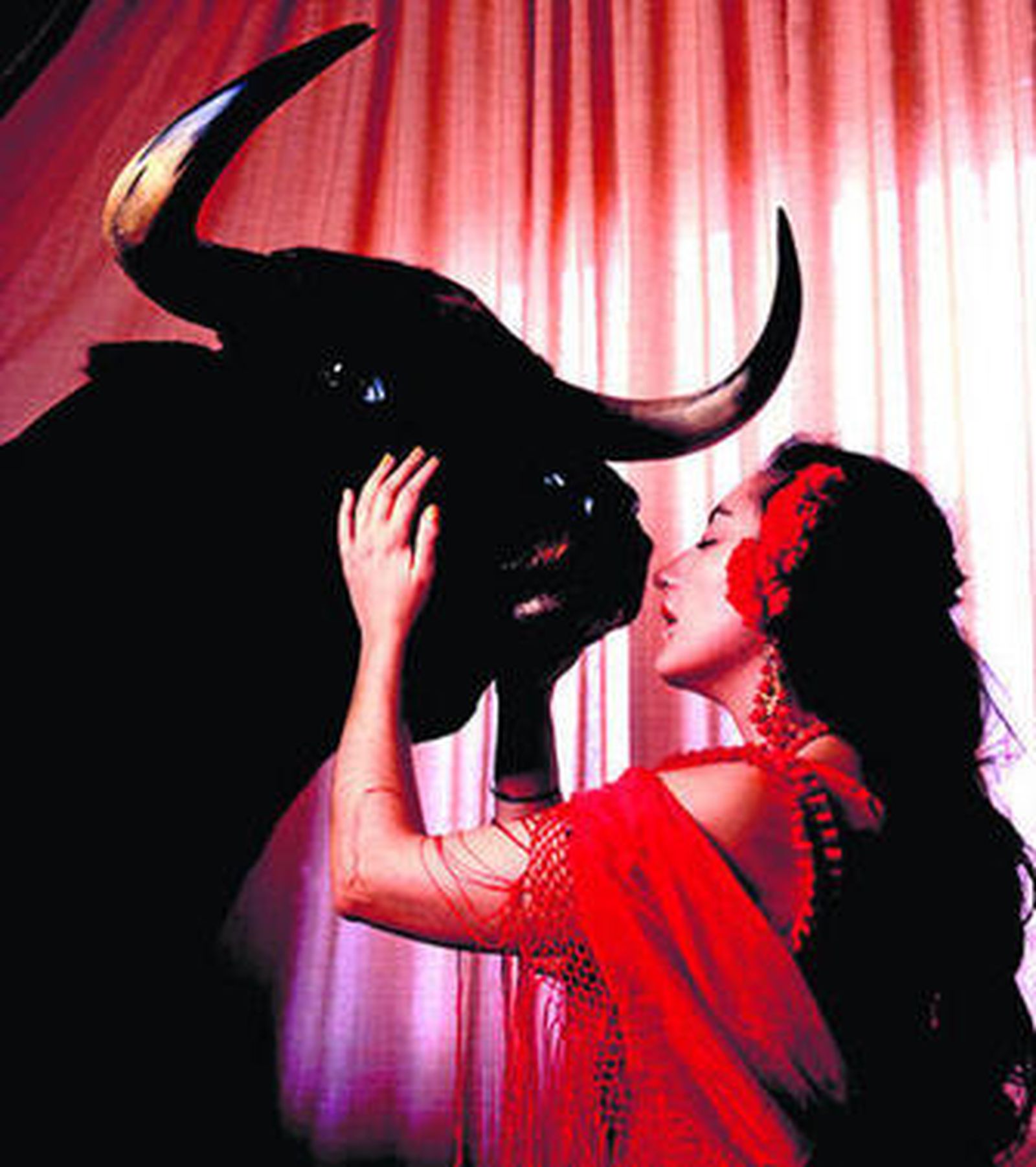 Pero vayamos por orden. La muestra comienza y termina con dos trabajos ya veteranos. Para empezar, Verónica (2001): en la gran fotografía, la autora, vestida de flamenca y cerrados los ojos, acaricia arrobada una gran cabeza de toro. El mantoncillo sobre los hombros ¿remite a la leyenda cristiana de la Santa Mujer Verónica, al toreo de capa, o a los dos, y a su clara presencia en Sevilla? ¿Permanece la obra entre ambos para que el espectador decida? No faltarán quienes vean aparecer en el horizonte el perfil de un Minotauro carente del aura que le otorgara Picasso, pero los ecos tabernarios de la cabeza de toro hacen pensar más bien en el varón que acodado en la barra parece dominar el mundo. Sea de ello lo que fuere, la pieza es poliédrica, una ironía de múltiples caras que al fin quizá apunten a la condición del macho presuntuoso, muerto y engañado.