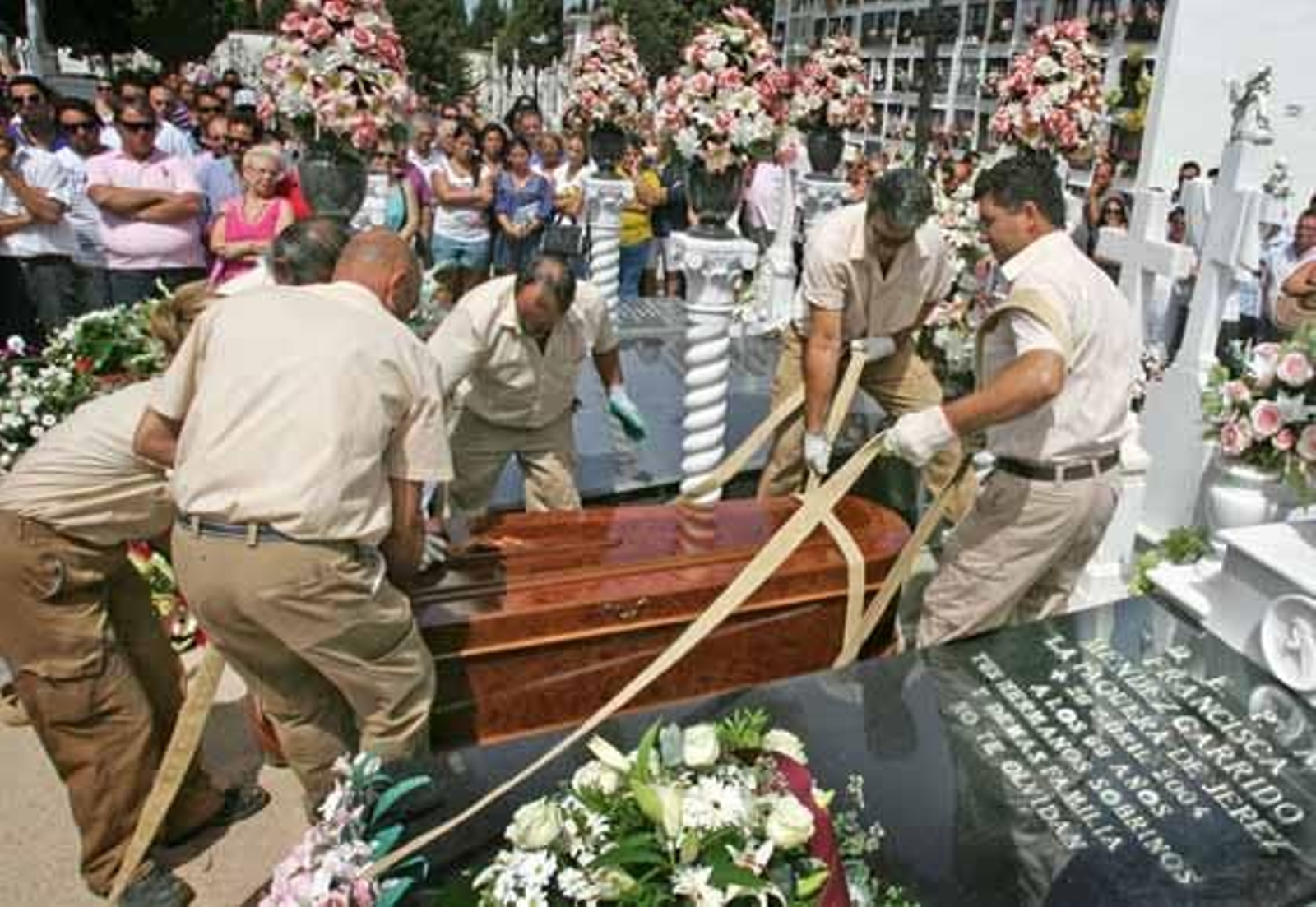 Partieron del tanatorio tres coches fúnebres totalmente cubiertos de coronas de familiares y amigos, entre los que se encontraba una cruz roja de claveles enviada por el cantante Alejandro Sanz.