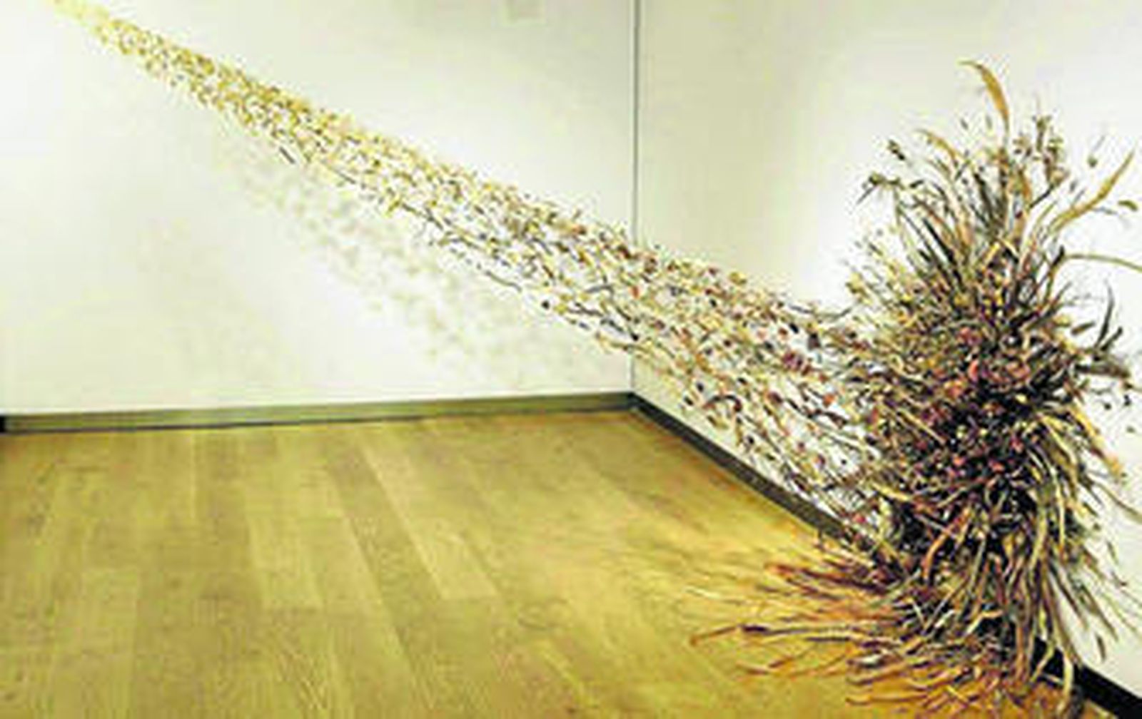 Hay un lugar más amplio y más nuestro, que tampoco escapa a los peligros propios de nuestro tiempo: la naturaleza. Sonia Espigares lo advierte con sus fotografías. La naturaleza puede ser refugio para el viajero, como indica sutilmente Detrás, o abrigo para una población, pero no está libre de amenazas: Asedio puede servir de pista. Tal vez por eso tendemos a estilizar la naturaleza, convirtiéndola en un desiderátum. Así lo hacen dos obras de la muestra. Alba Moreno y Eva Grau construyen una escultura que me parece sutil metáfora del cuerpo inteligente. Si el gran cilindro de cobre remite a la condición del animal humano, bípedo que por ser tal puede mirar a lo lejos, superando obstáculos e intereses mezquinos, el fragmento de malaquita, en su base, recuerda que somos carne y hemos de pisar tierra para -como el titán Anteo- recuperar fuerzas. En el mismo sentido, Refugio de Lola Guerrera: la diagonal de flores, hojas y hierbas despierta la memoria de la naturaleza como acogida.